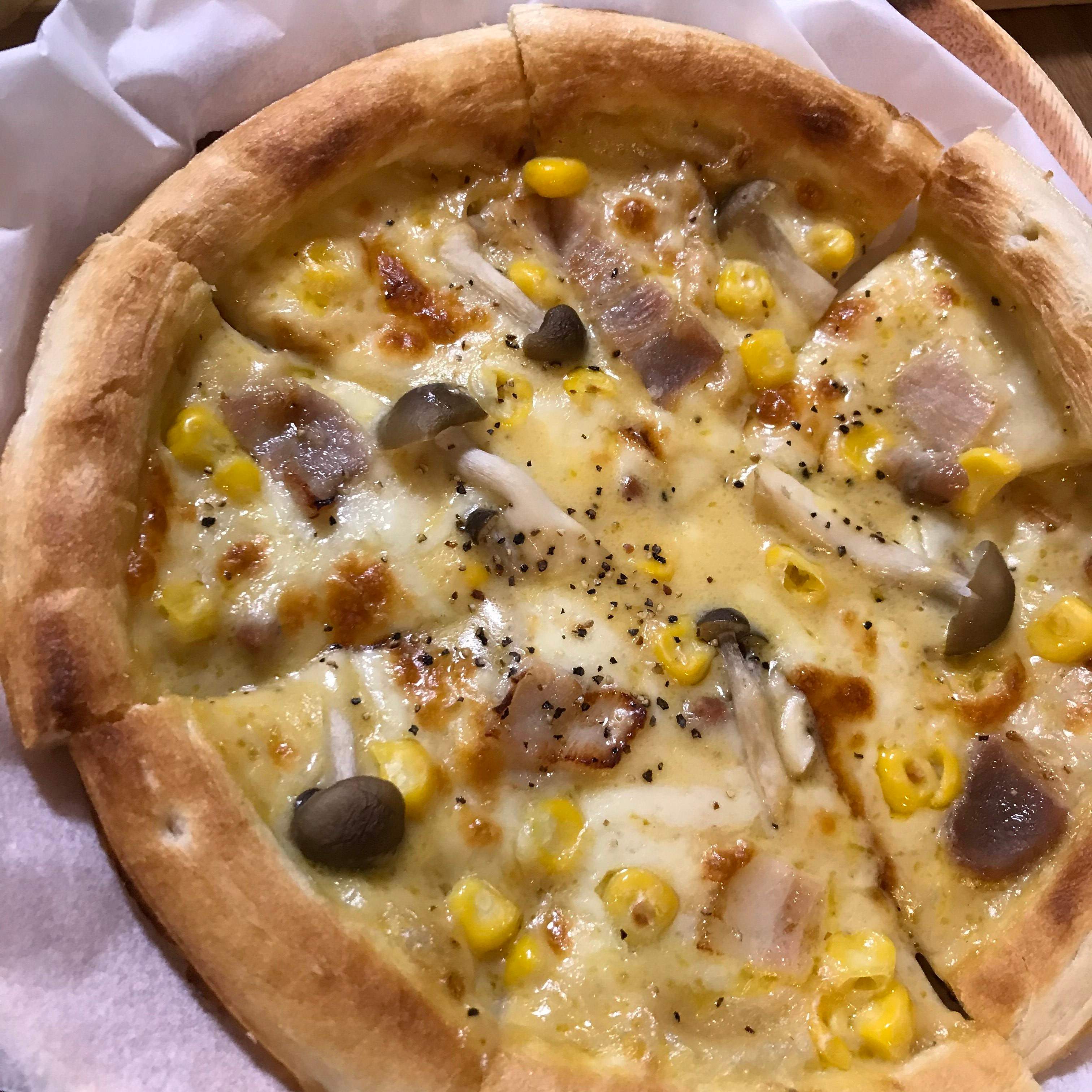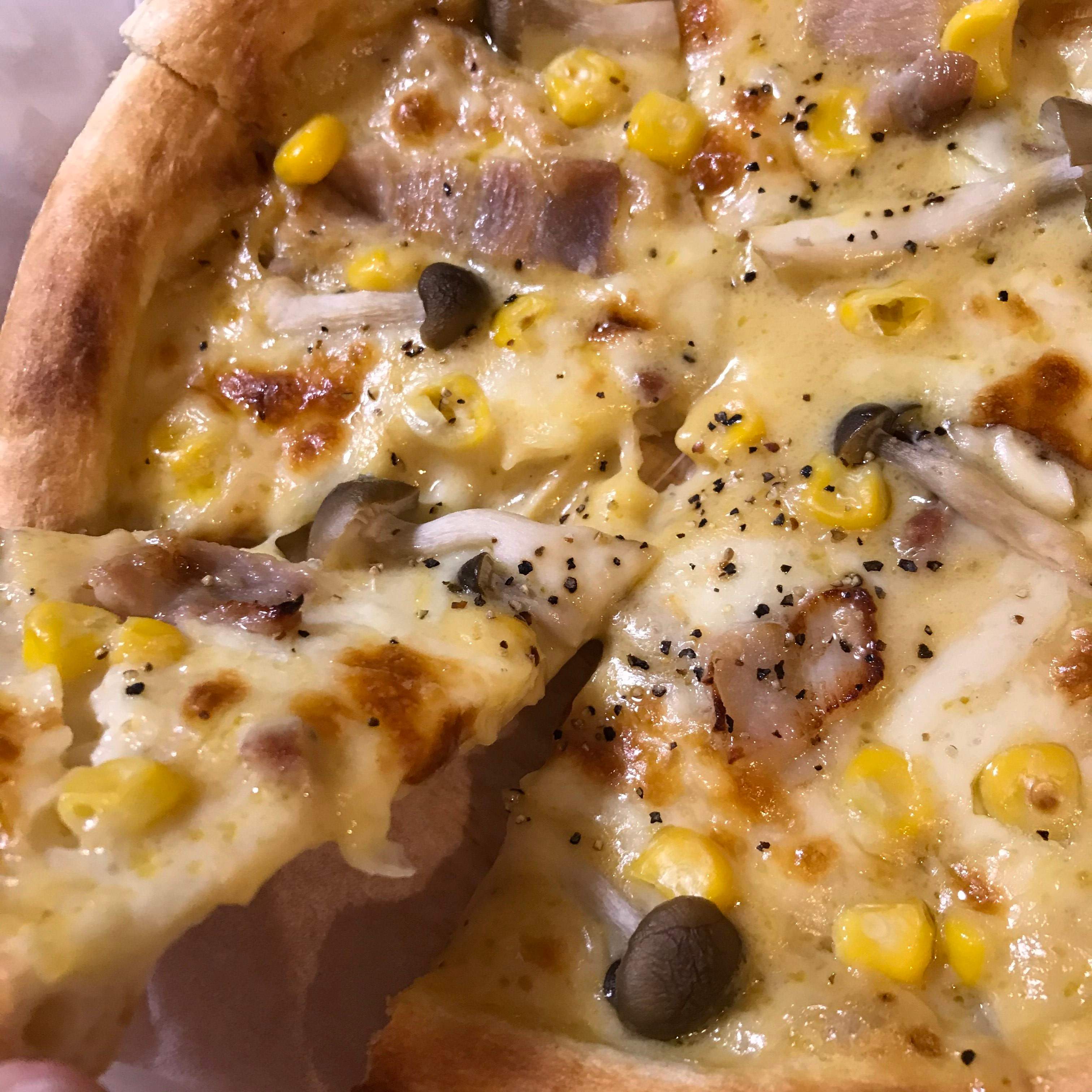 具は家にあったベーコンときのこ、コーンです。チーズはほんの少しだけのせてますが肝心のカルボナーラソースがたっぷりなので食べ応えもばっちり!