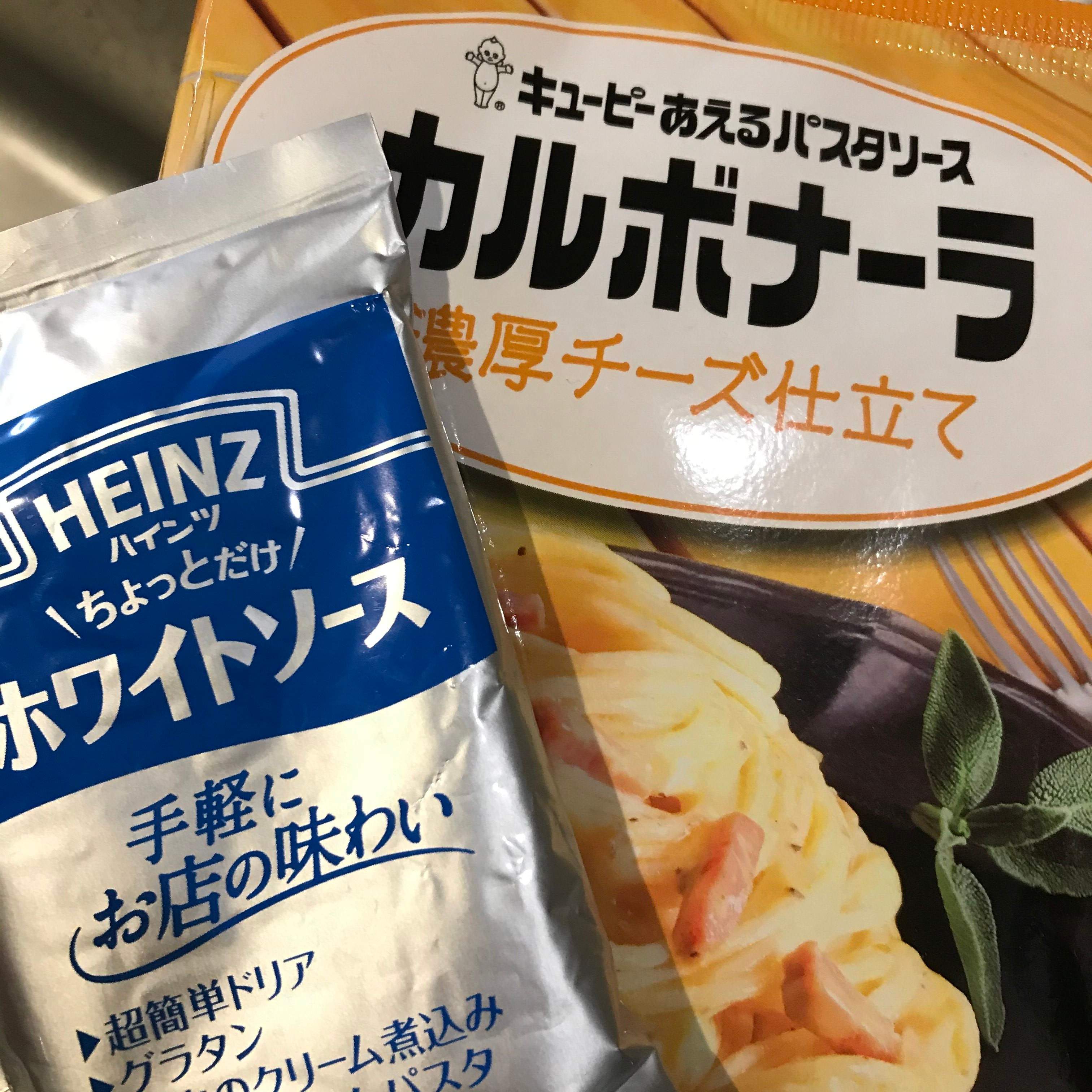 とはいえソースも超簡単!市販のカルボナーラソースとホワイトソースを混ぜるだけ!