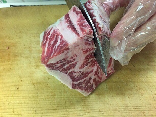 まず、お肉の中に大きな骨が並んでいるので骨と骨の間に包丁を入れてカットします。