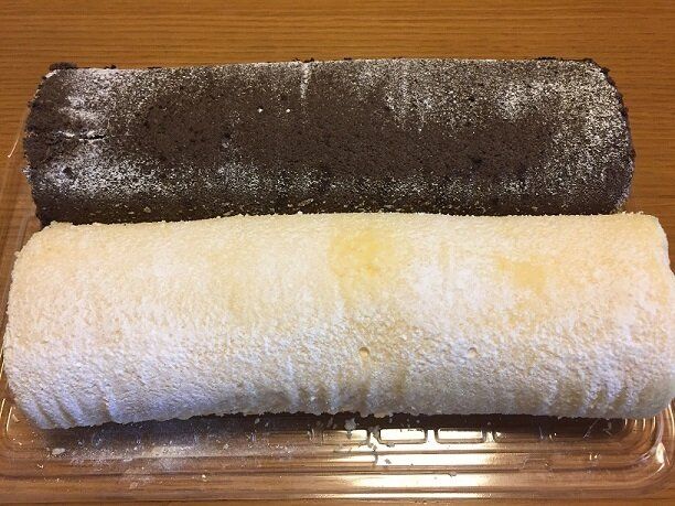 プレーンとココア生地の2種類、大きな大きなロールケーキです。