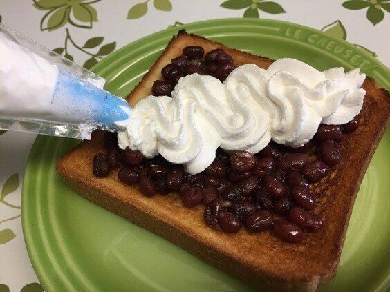 トーストに小豆あんをのせて、その上にたっぷりとホイップを!