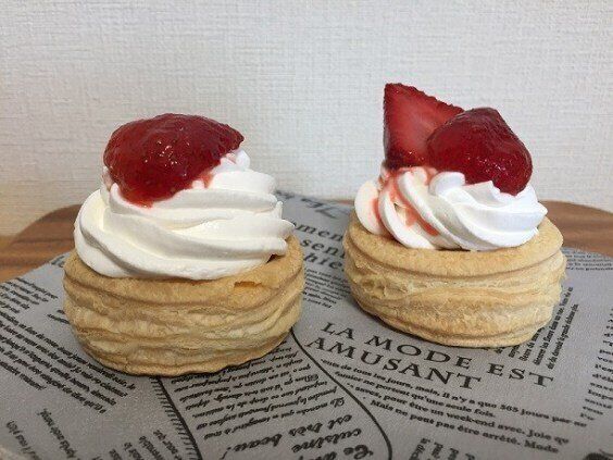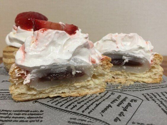パイ生地の中に業務スーパーのぷち大福を入れてホイップを絞り、苺をトッピングしました。