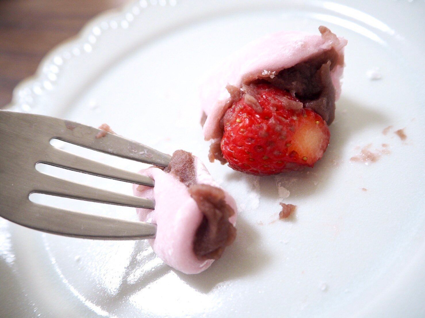 真ん中に入っているいちごは酸味もあり、甘い大福とよく合います。噛むとしっかりと果汁を感じられてみずみずしさがたまりません。