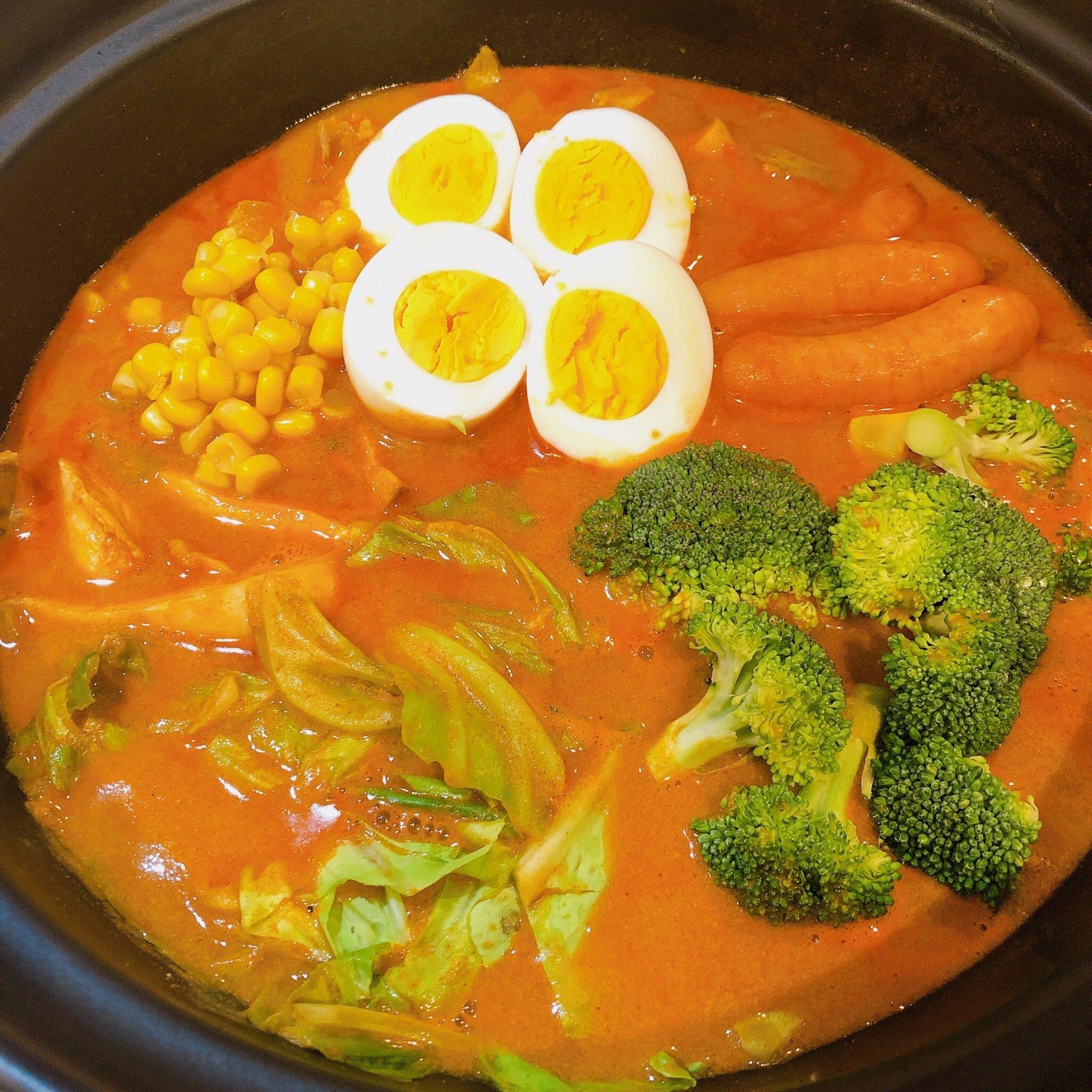 おすすめの具材は鶏肉、ブロッコリー、キャベツ、ほうれん草、トマト、エリンギ、ゆで卵です。