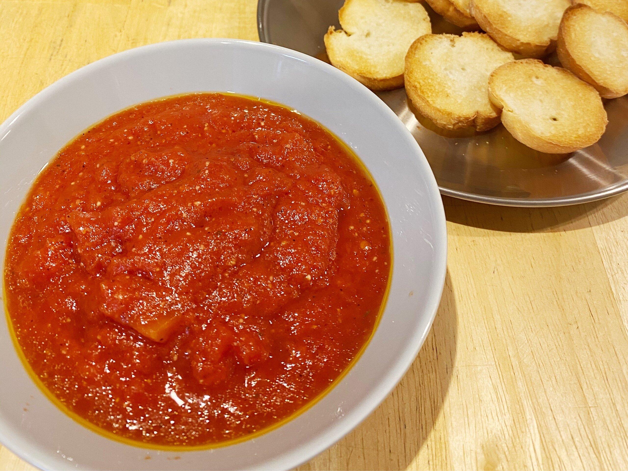 トマト缶にアヒージョシーズニング1袋を入れて煮込むと、バケットに合うおいしいディップにもなりますよ!