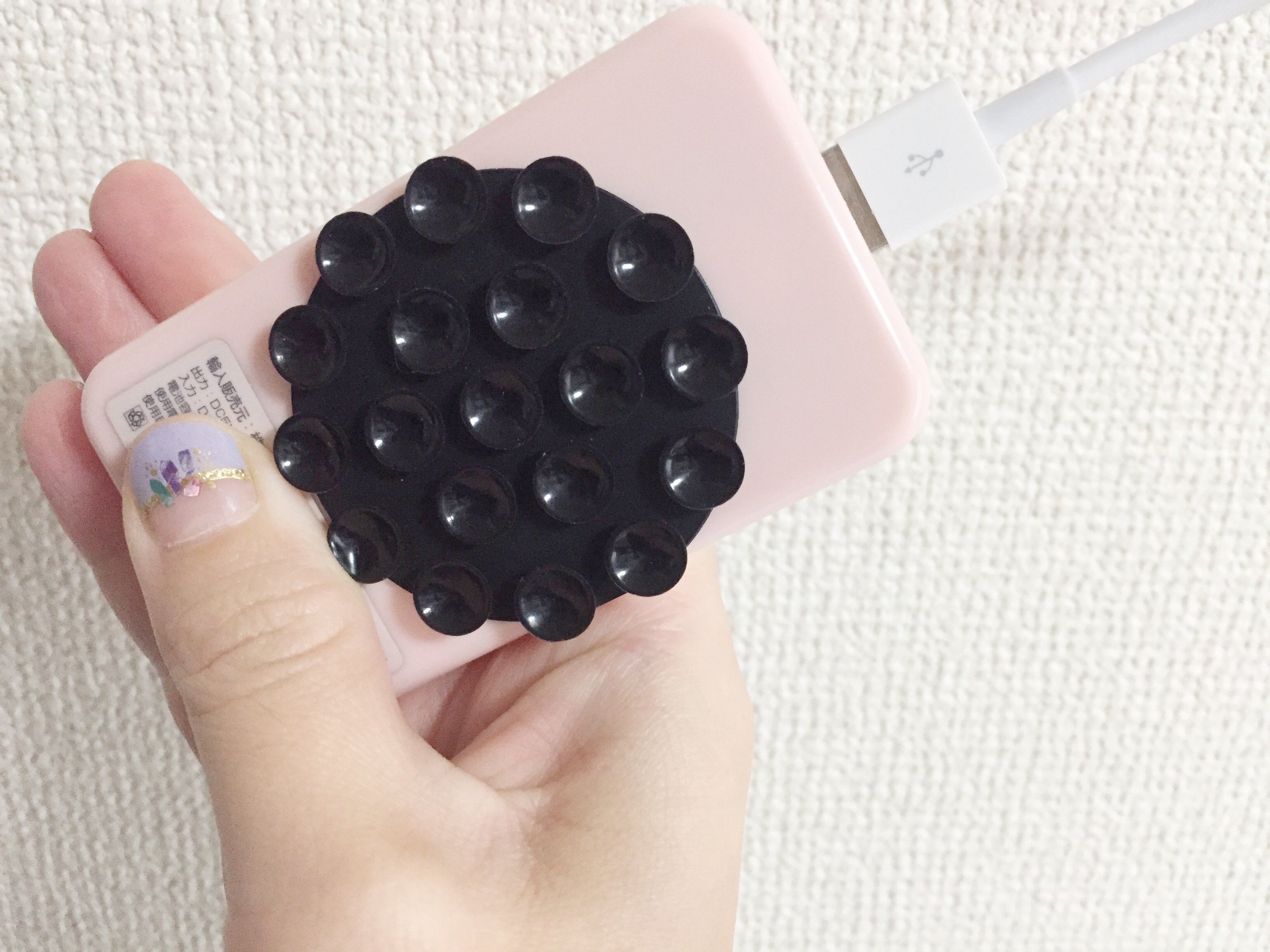 吸盤の後ろには両面テープがついていて、手持ちのモバイルバッテリーに貼り付けて使います。