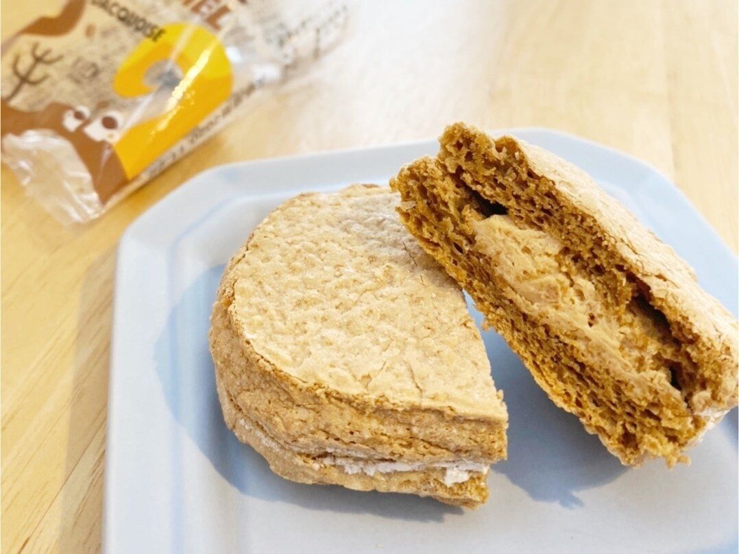 オリジナルのコーヒー(インスタント・ザ・マイルド)を混ぜた生地でキャラメルチョコチップ入りのアーモンドクリームをサンドしたダックワーズ。