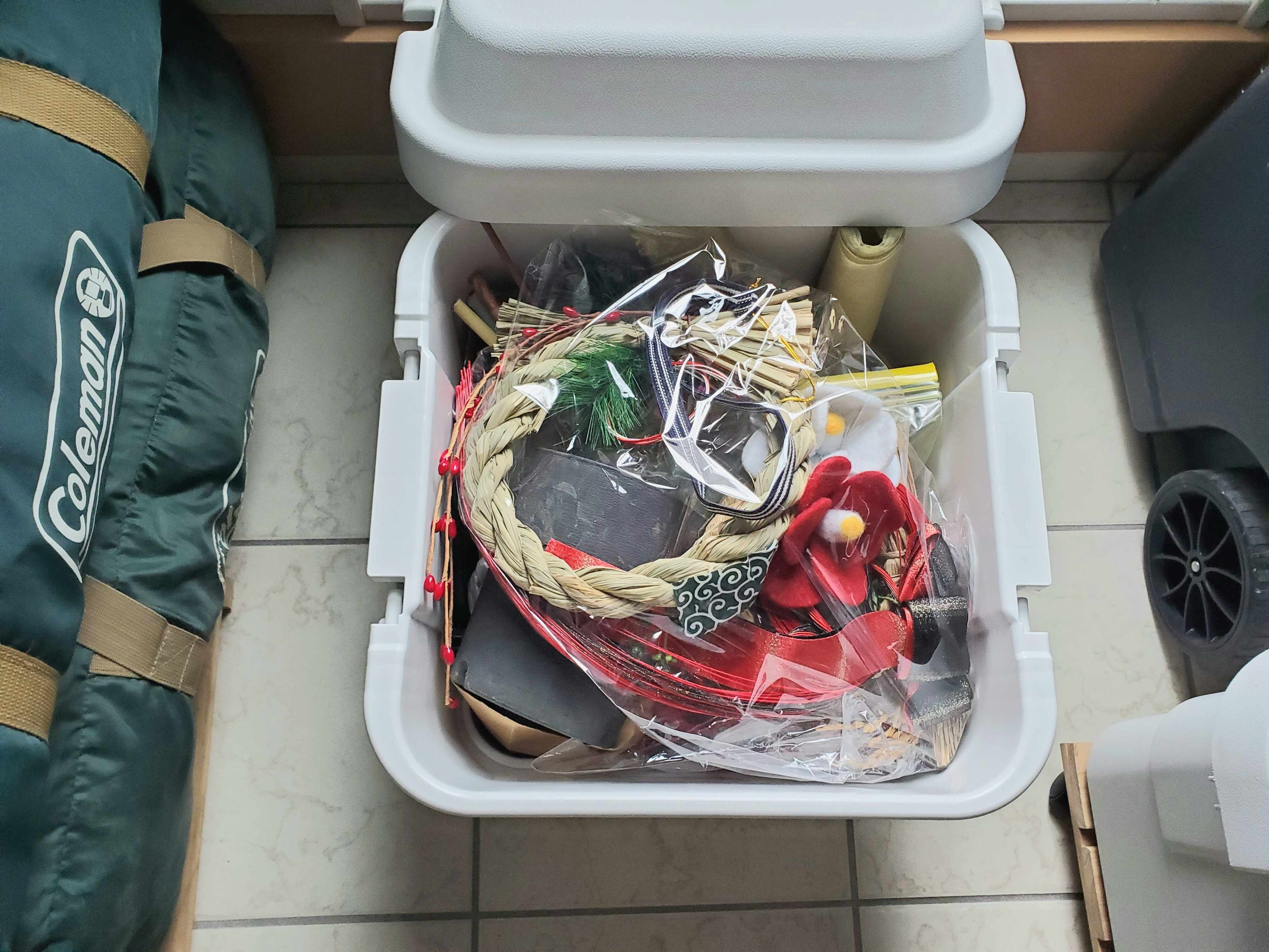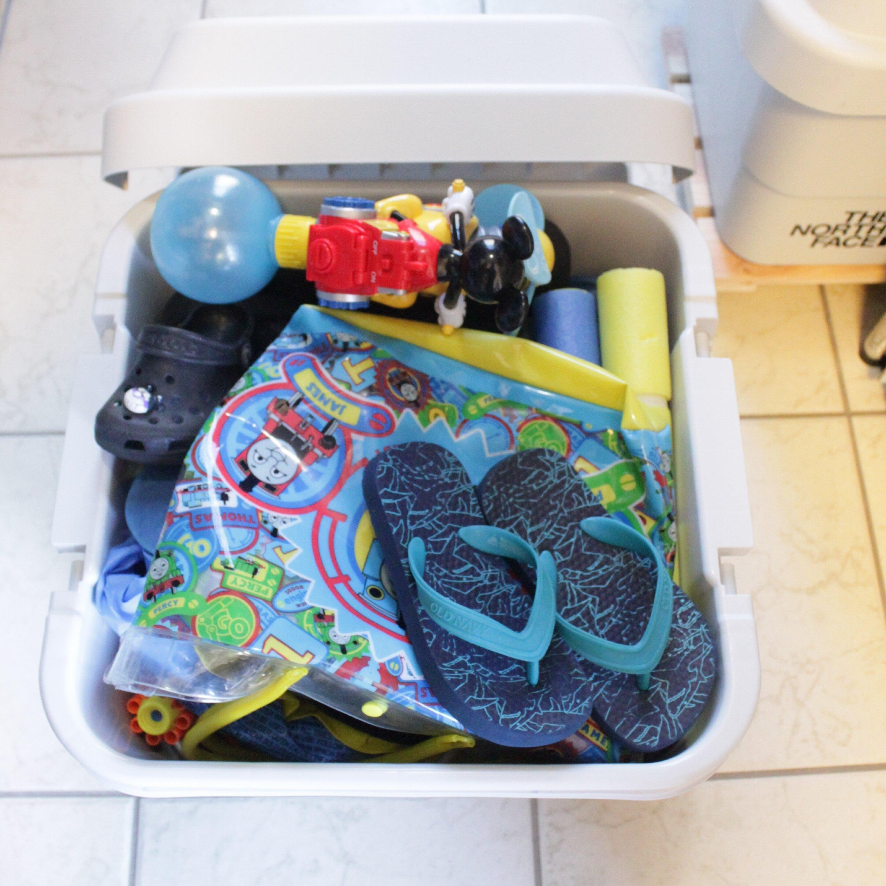 並べて、夏のプール関係のグッズ(ビニールプールや浮き輪、ビーチサンダル、水鉄砲など)をざっくりまとめて収納しています。