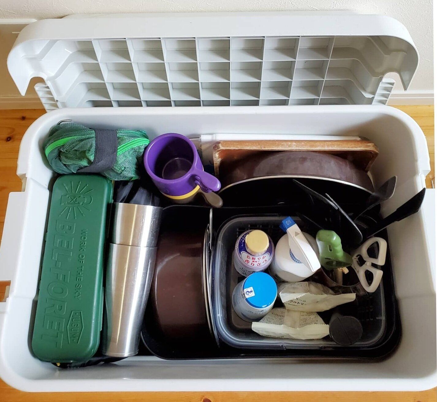 わが家は、キャンプに持ち出すキッチングッズをこのようにまとめて積んでいきます。
