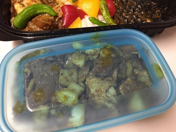 こちらはスパイスカリーチキン。パプリカやししとうは除いてお肉は保存容器に入れて冷凍しました。