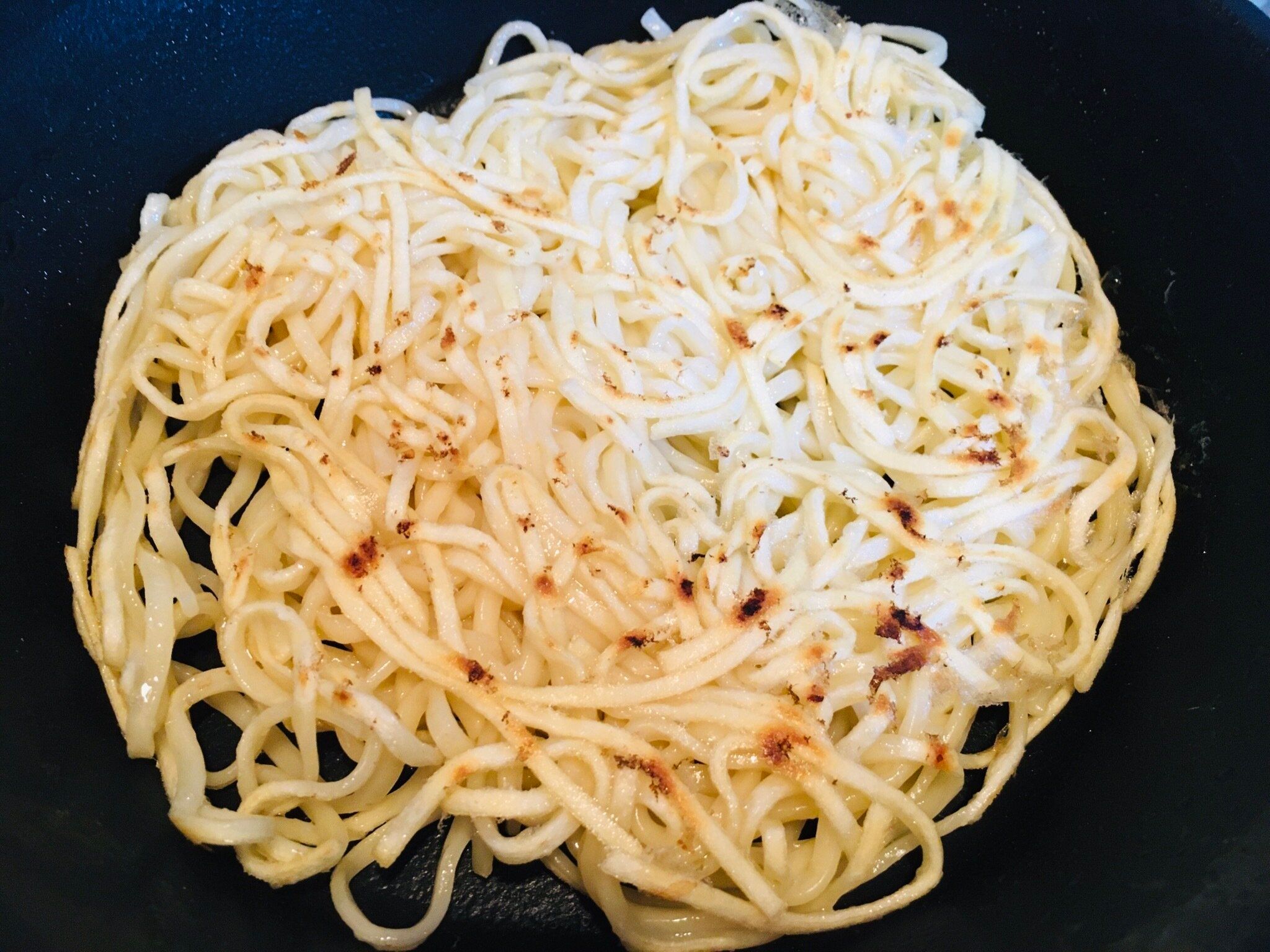 麺を湯切りし、サラダ油を絡めたら、油を熱したフライパンで両面パリッとするまで焼き、取り出します。