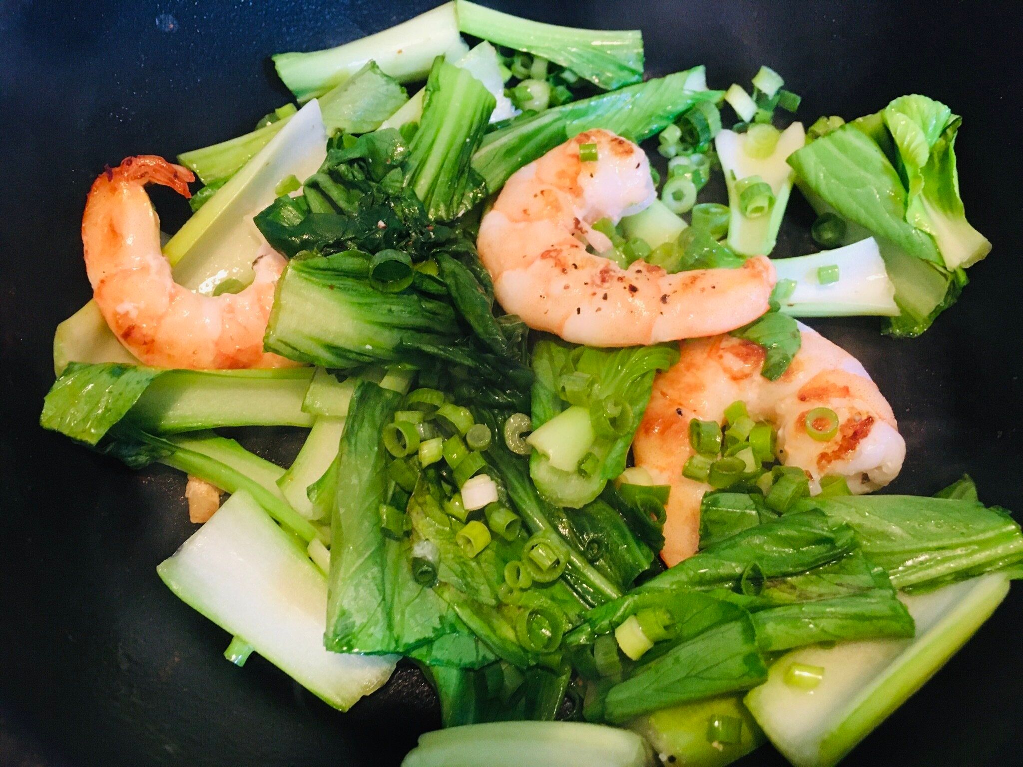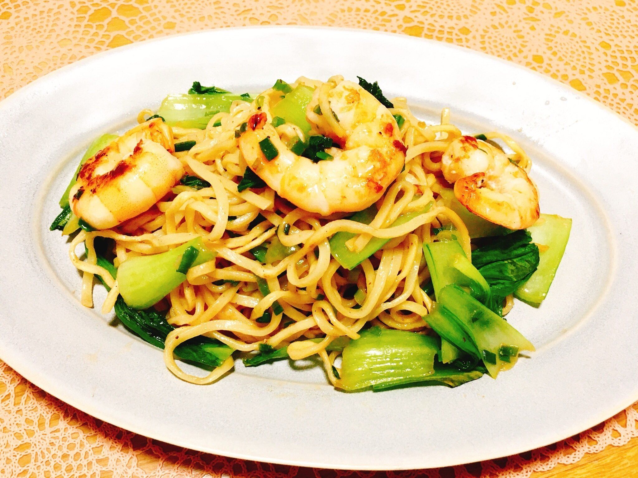 商品には海老、ねぎを加えるほか、豚肉や野菜なども具材としておすすめと書いてあります。今回は海老のほか、あまり野菜のちんげん菜と小葱を加えました。
