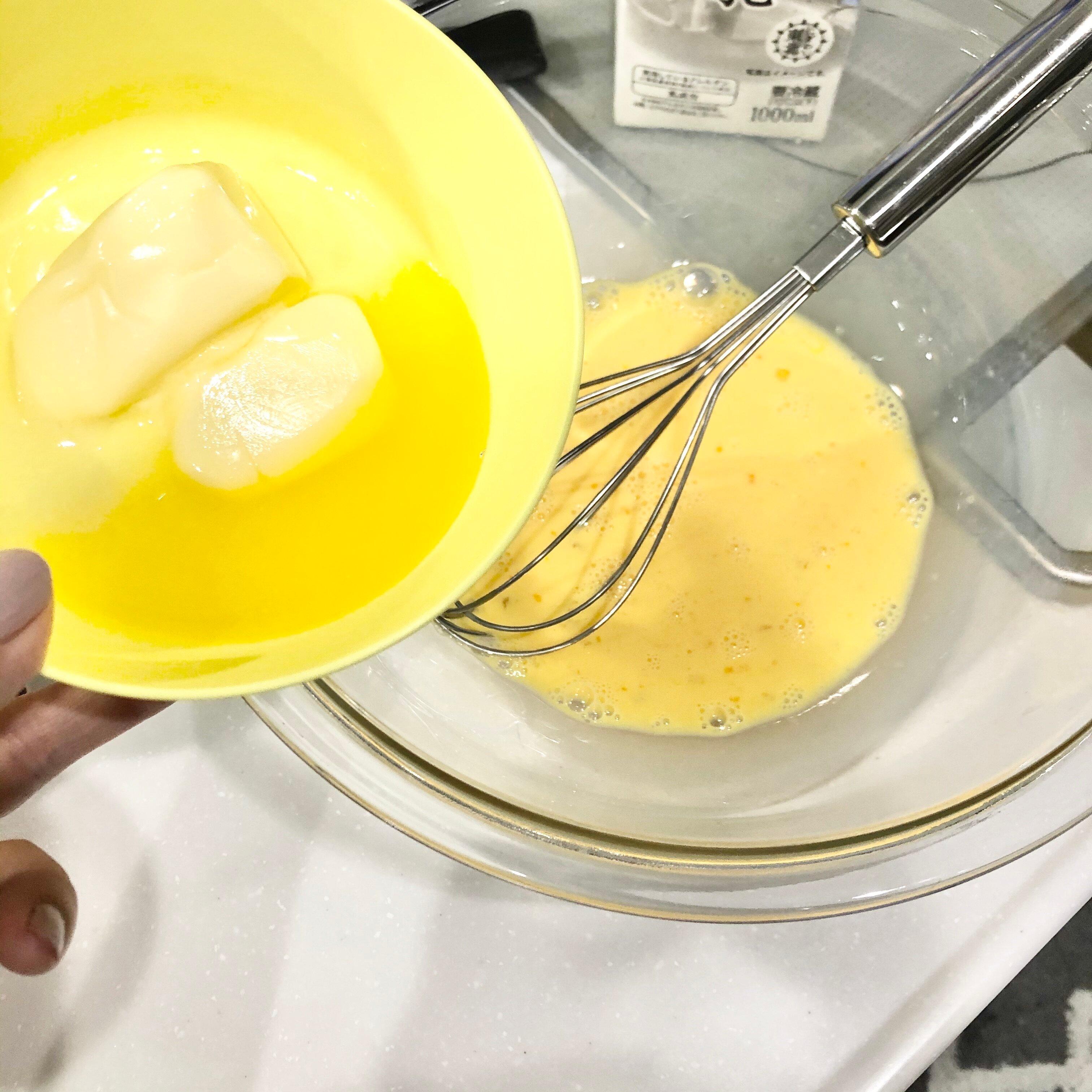 バターを電子レンジで500w50秒を目安に溶かし、先ほどのボールに入れさらに混ぜます。