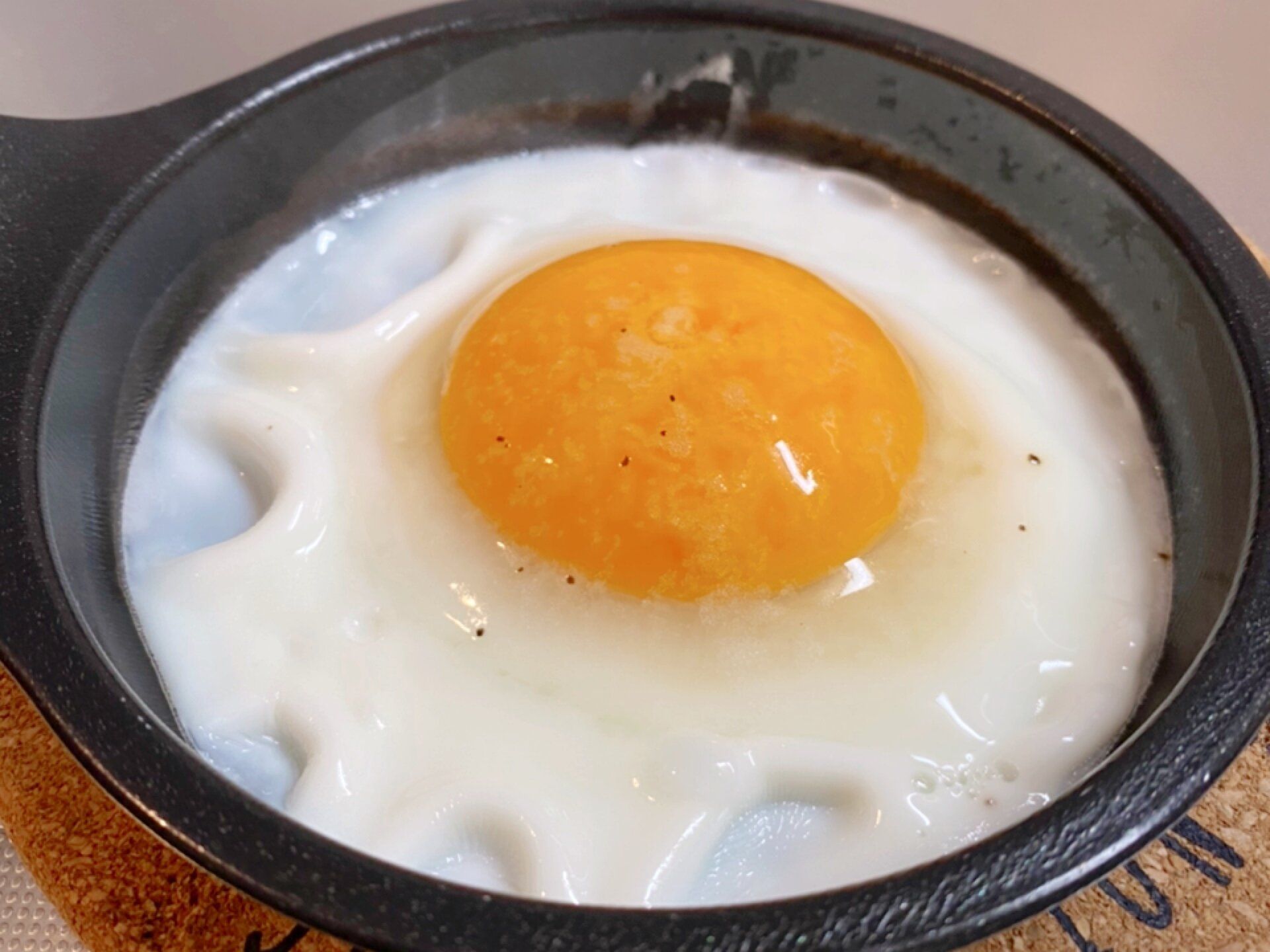 100均などで売っている目玉焼きプレートに卵を割り、トリュフ塩をふりかけて、トースターで加熱します。