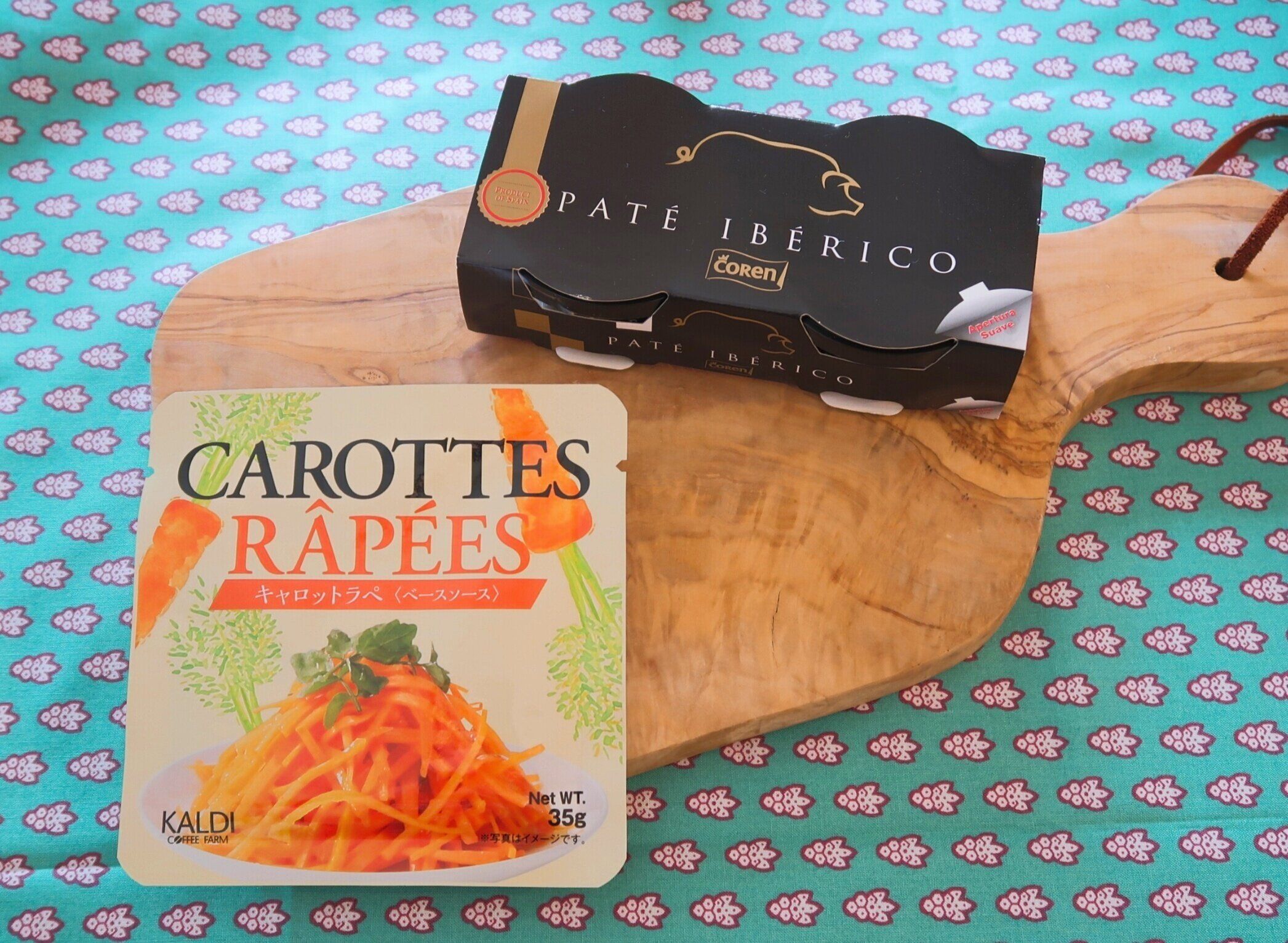 カルディの商品2つを使ったお惣菜が主役の、超簡単!デリ風カフェプレートが完成しました。バゲットにレバーパテをのせていただきます。