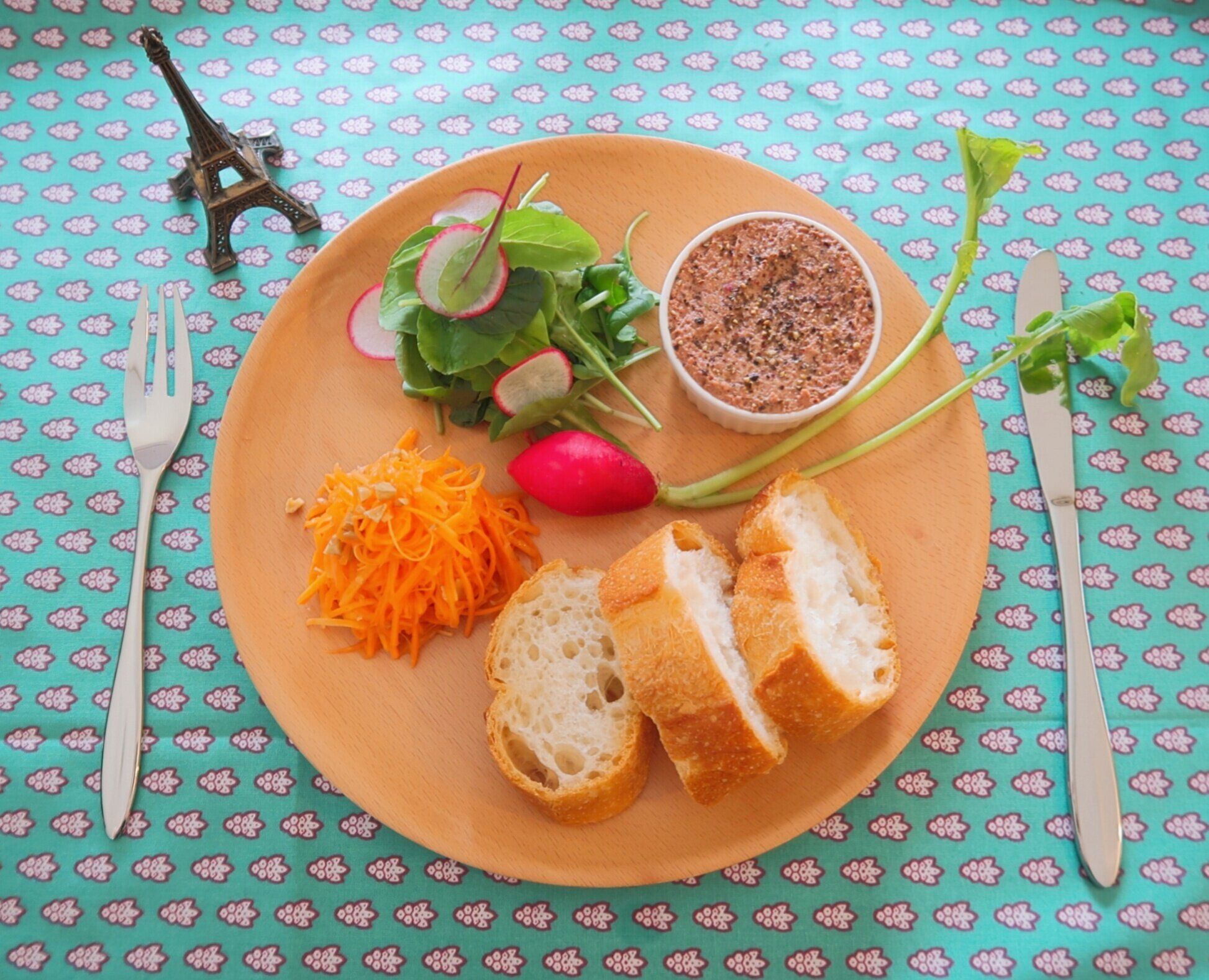 完成したキャロットラぺとレバーパテを、お好みのサラダやバゲット(またはお好みのパン)と一緒に、お気に入りのプレートに盛りつけます。