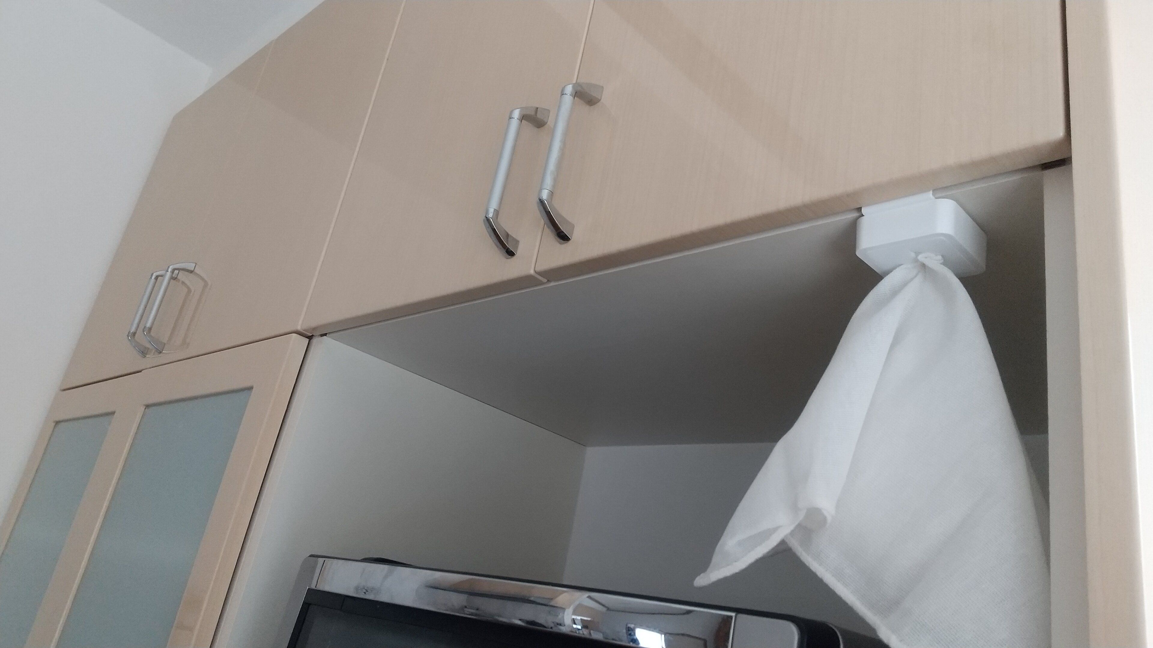 置き場に困る布巾などを簡単に空中収納でき、空間を有効活用することができて便利です。