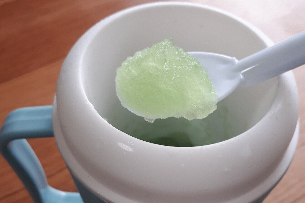 メロンソーダを入れましたら、待ちきれない子ども達が半分ほど飲んでしまったのですが、この通り美味しいフローズンドリンクになりました!