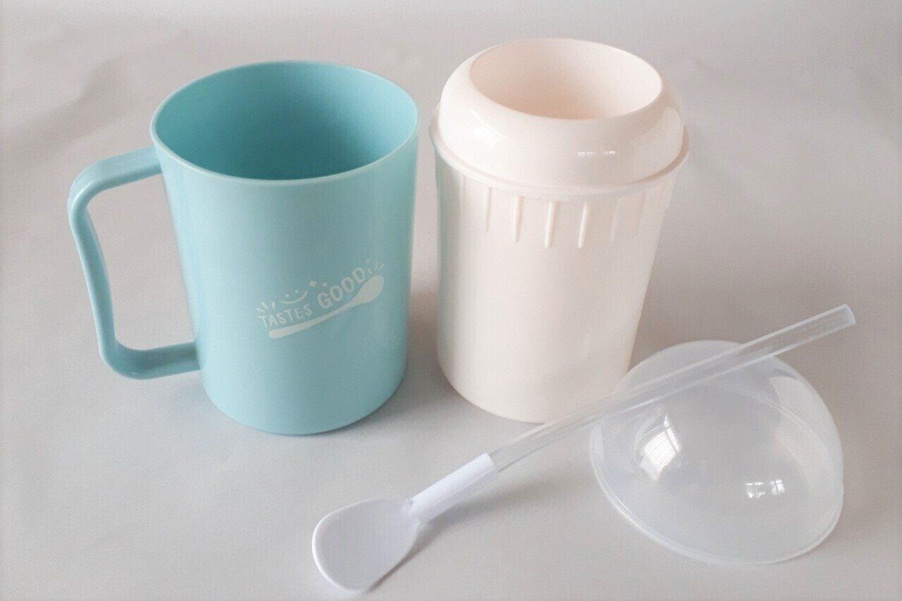 冷凍庫で一晩凍らせた内カップを外カップに入れ、ジュースを入れたらゆっくりかき回すだけ!