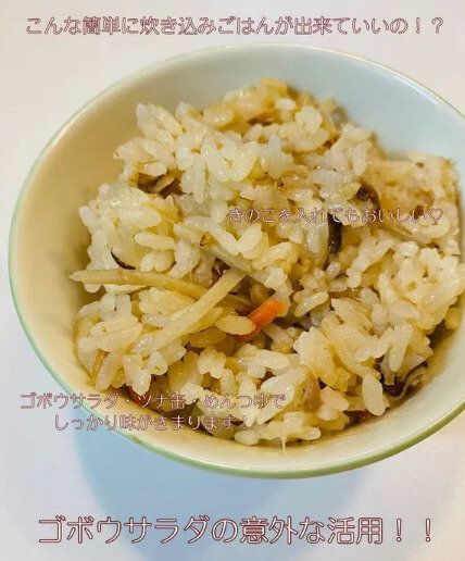 そんなまゆてぃさんのおすすめの一つが、1kg入りを400円以下で買うことができる、大人気の「ゴボウサラダ」。ただ、1kgもあると、何に使おうかと迷う人も多いのでは?まゆてぃさんおすすめのレシピがこの「ゴボウサラダ」をつかった炊き込みご飯。つくりかたは、炊飯器に米2合とめんつゆ(2倍)を大さじ2、塩2つまみを入れたら、目盛りよりもほんの少しすくなめに水を入れます。そこに「ゴボウサラダ」100g、ツナ缶1缶を入れてあとはいつもどおりに炊くだけ。子どもたちがおかわりしてくれるほどのおいしい炊き込みご飯ができあがり。サラダに使うだけじゃもったいない!ぜひ試してみたいですね。