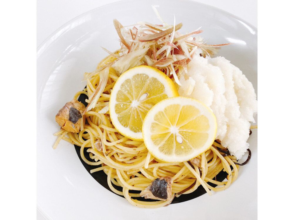 - 塩レモンおろしのせサバ缶と塩昆布のパスタ