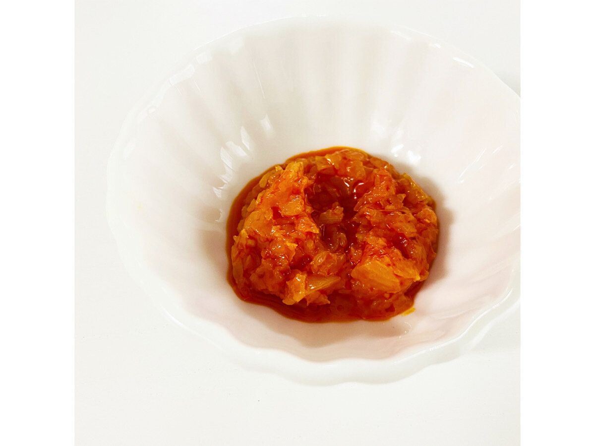 主な原材料は、玉ねぎ、にんにく、生姜、唐辛子などで中身はラー油のように赤く色づいていています。