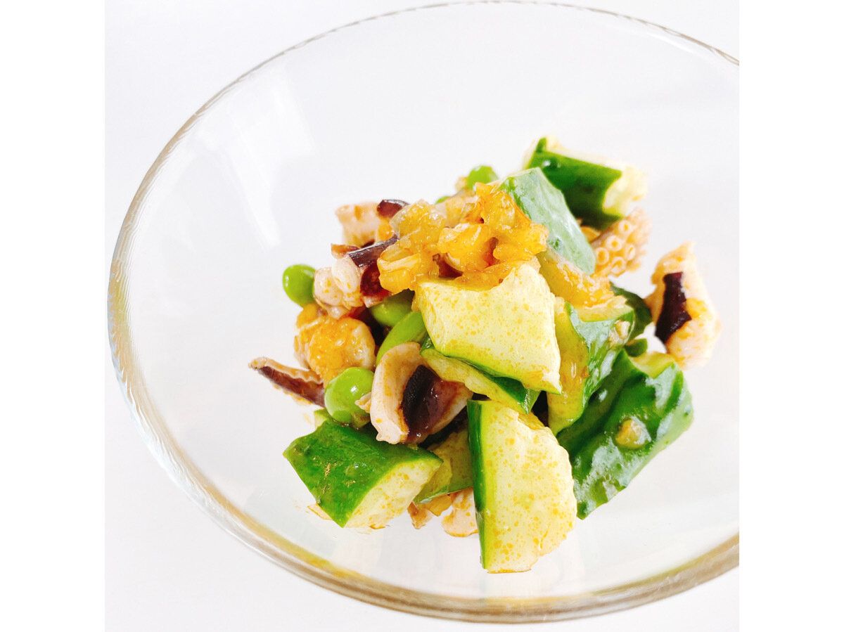 • タコ・きゅうり・枝豆の洋葱醤和え