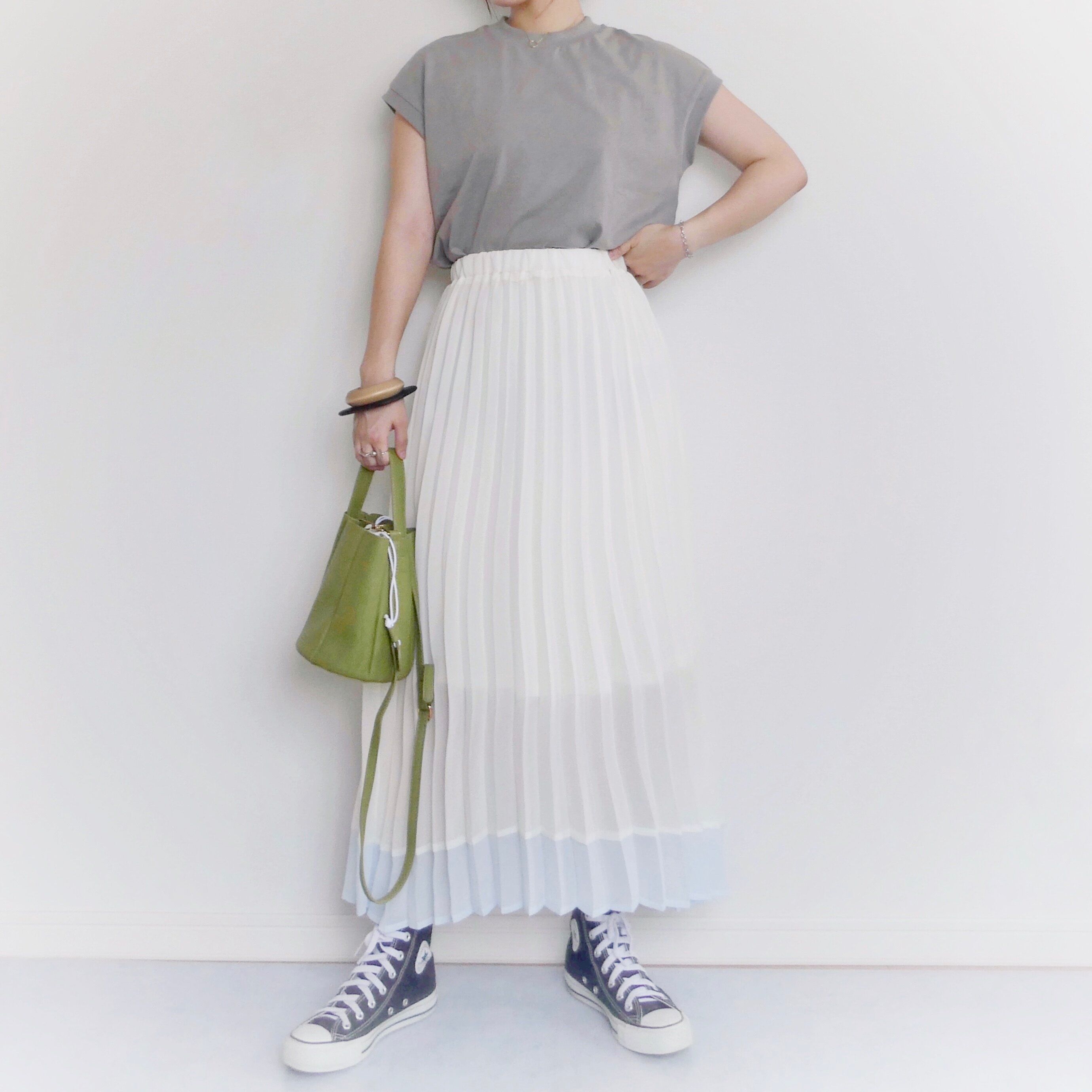 このフレンチスリーブTシャツが二の腕の細見えを叶えてくれるらしいので、実際にコーディネートを見てみましょう!