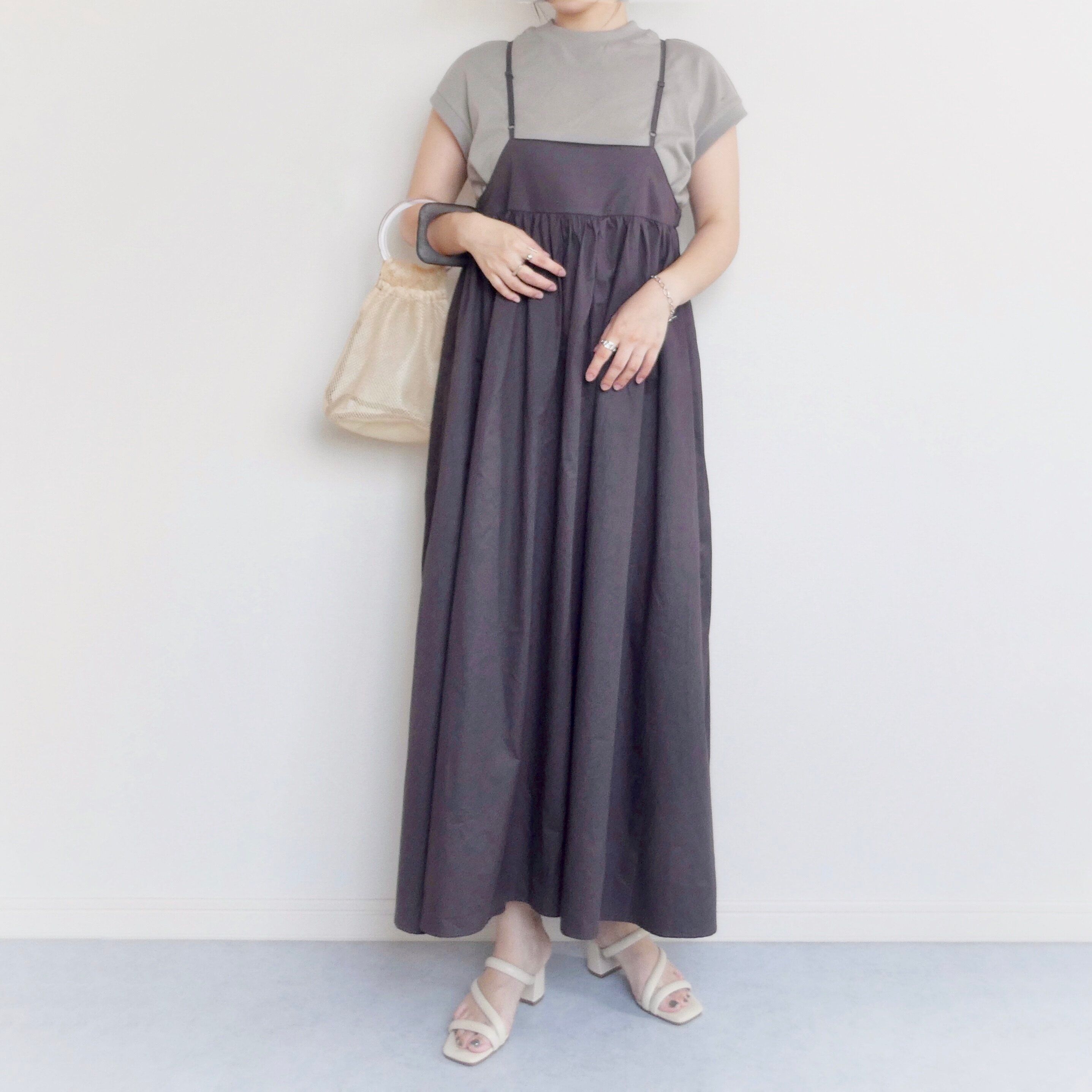 キャミワンピースの細めのストラップが女性らしく、さらに細見え効果が抜群です。