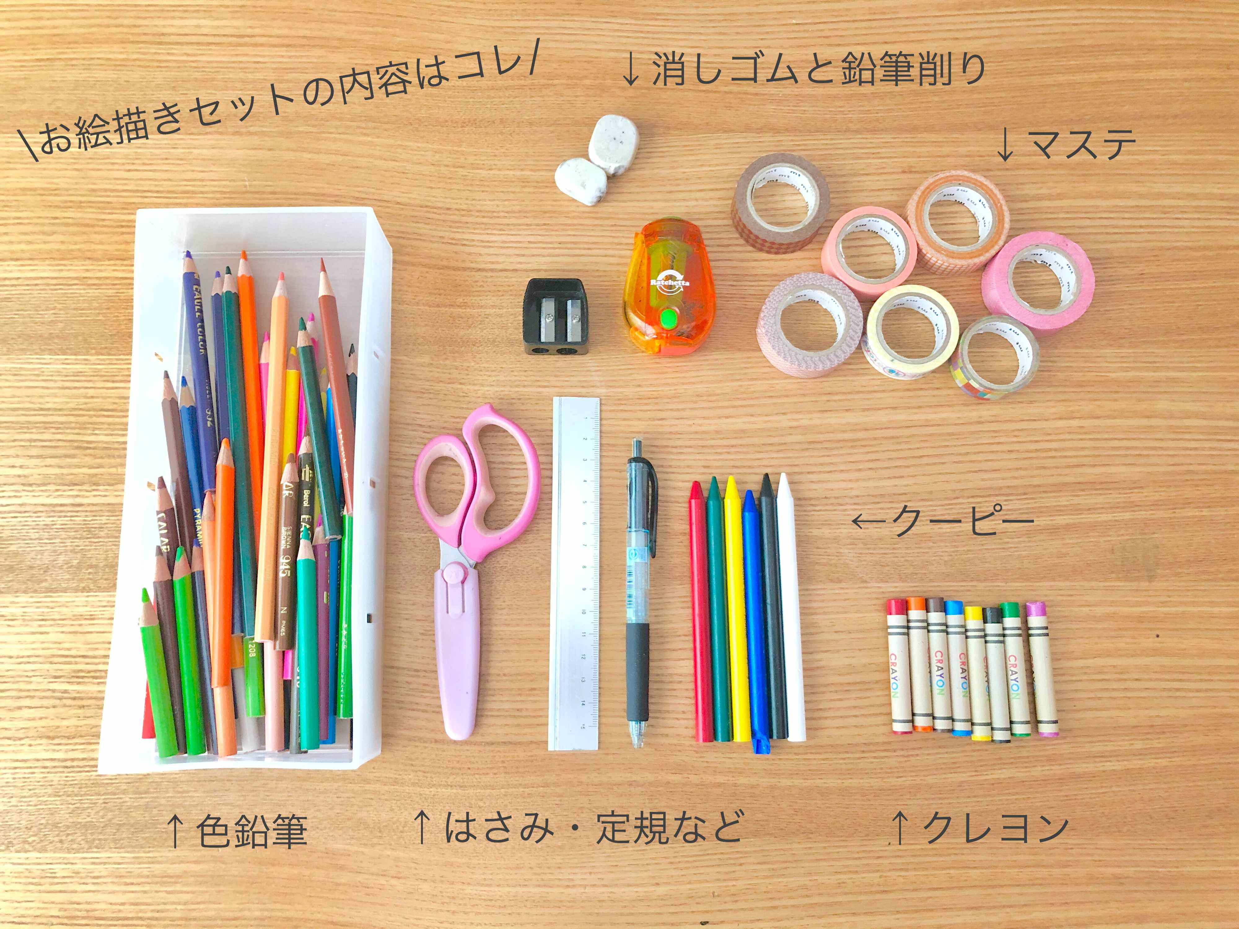 色鉛筆、クレヨン、マーカー、消しゴムに鉛筆削り、ハサミやマステ・・・本当にこまかいものがたくさん!