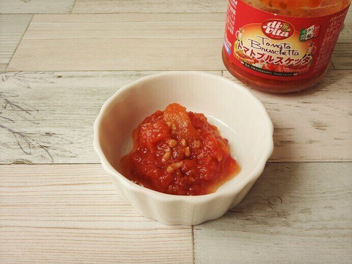 バゲットやクラッカーに乗せて食べるペーストソースで、たっぷりのトマトにオリーブオイル、にんにく、オレガノが入っています。