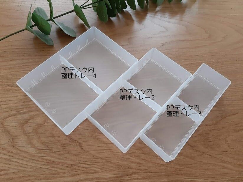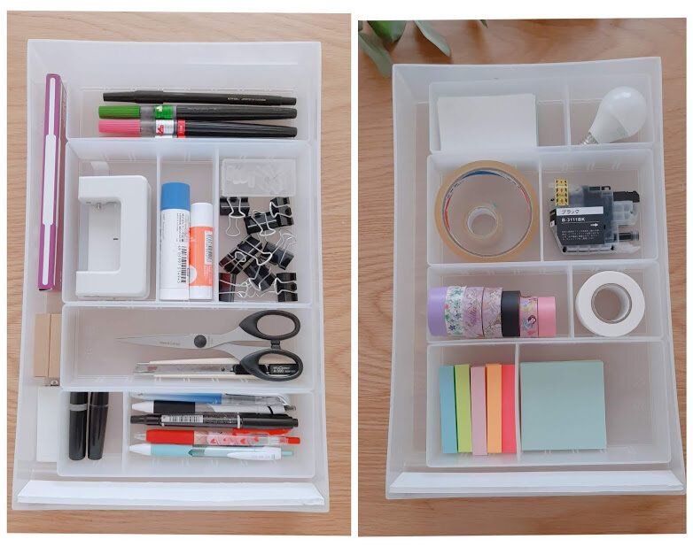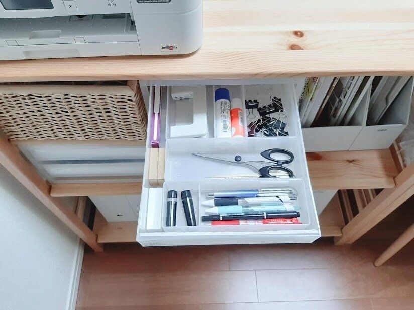 文房具などの細かいものを収納するには引出しが使いやすいです。わが家は無印のポリプロピレンケース(引出式・薄型・2段)にPPデスク内整理トレー(2.3.4)を組み合わせて収納をつくっています。組み合わせ方によってはピッタリと仕切ることができます。