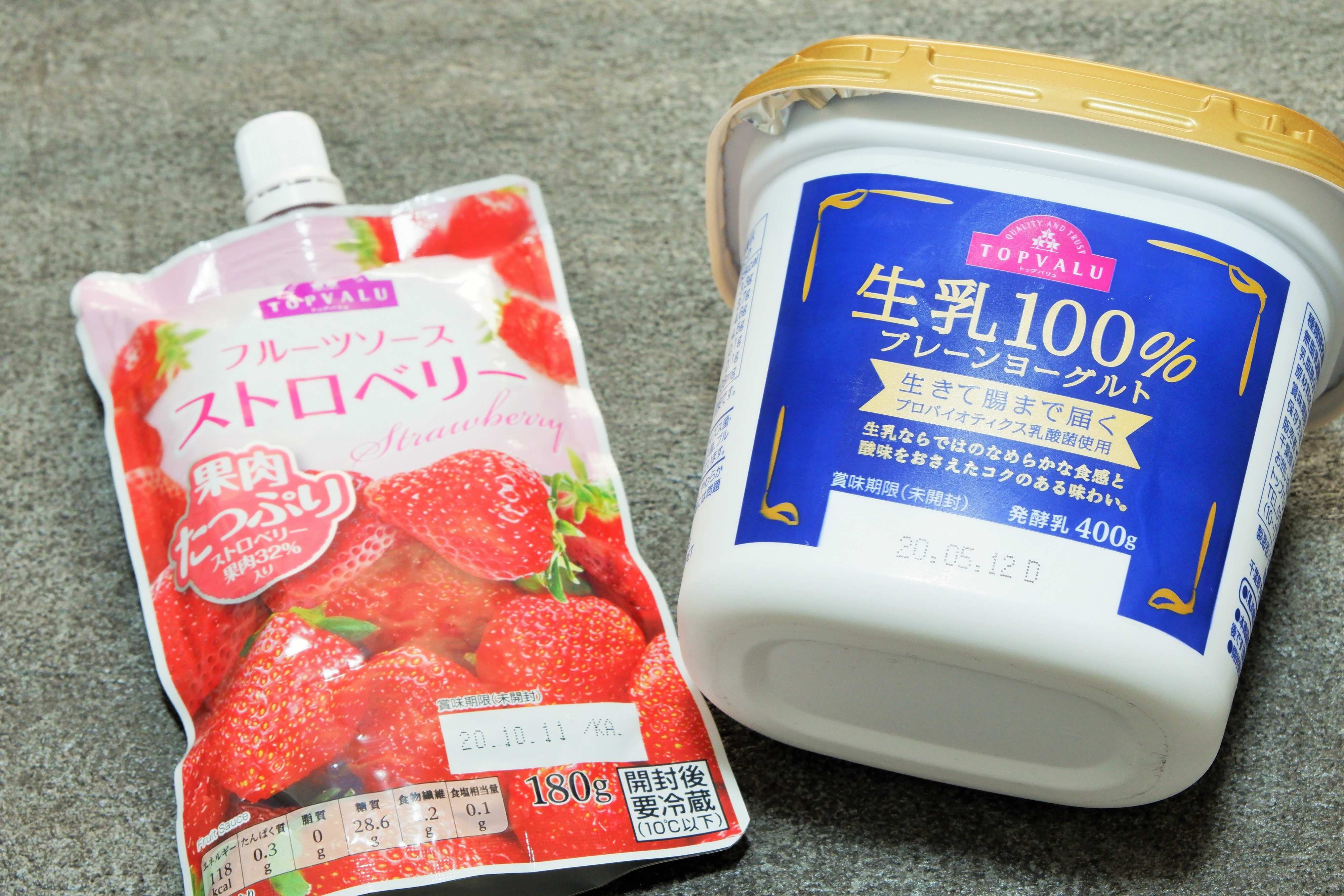 そのままでももちろんおいしいのですが、甘みがほしい人におすすめなのが同じくトップバリュのフルーツソース。188円です。