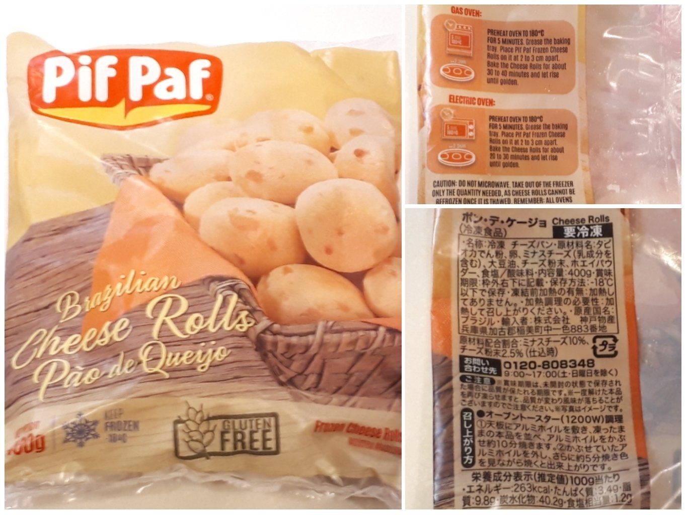 ブラジルはポン・デ・ケージョの本場。小麦粉ではなくタピオカでん粉が使われていて、グルテンフリーの商品です。パッケージ裏に日本語で召し上がり方として、オーブントースターでのつくり方が記載されています。少し時間がかかりますが、私は左上に英語で記載されているオーブンを使う方法でつくっています。180℃に温めたオーブンで20~30分焼きます。
