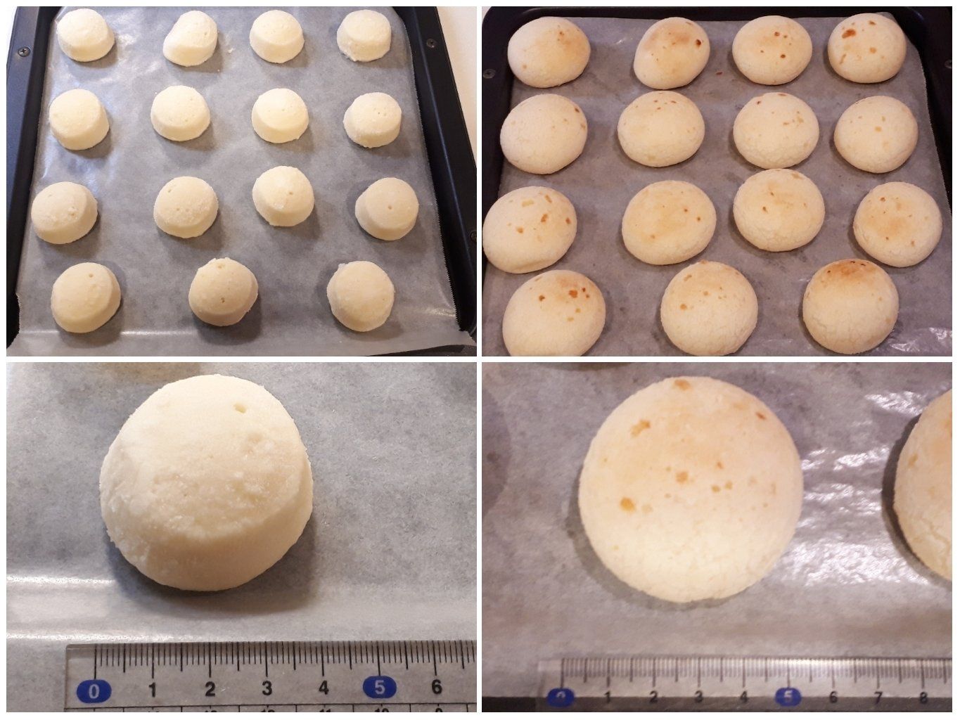わが家の場合は1袋が1日でなくなるので、1袋分トレーにのせてオーブンで焼いてしまいます。焼く前は直径4cmくらいの大きさで、焼くと直径5cmくらいのコロコロとしたポン・デ・ケージョができ上がります。
