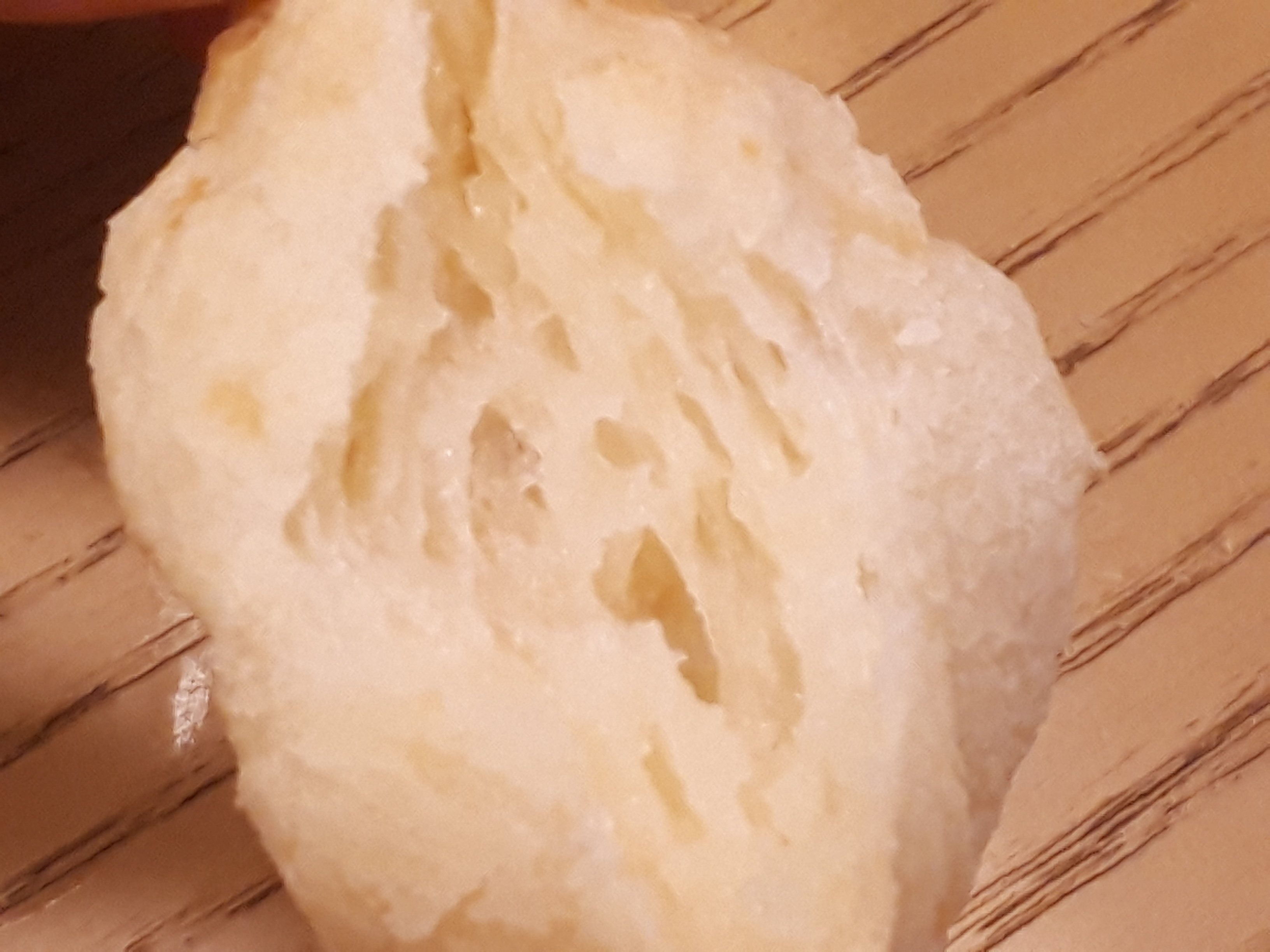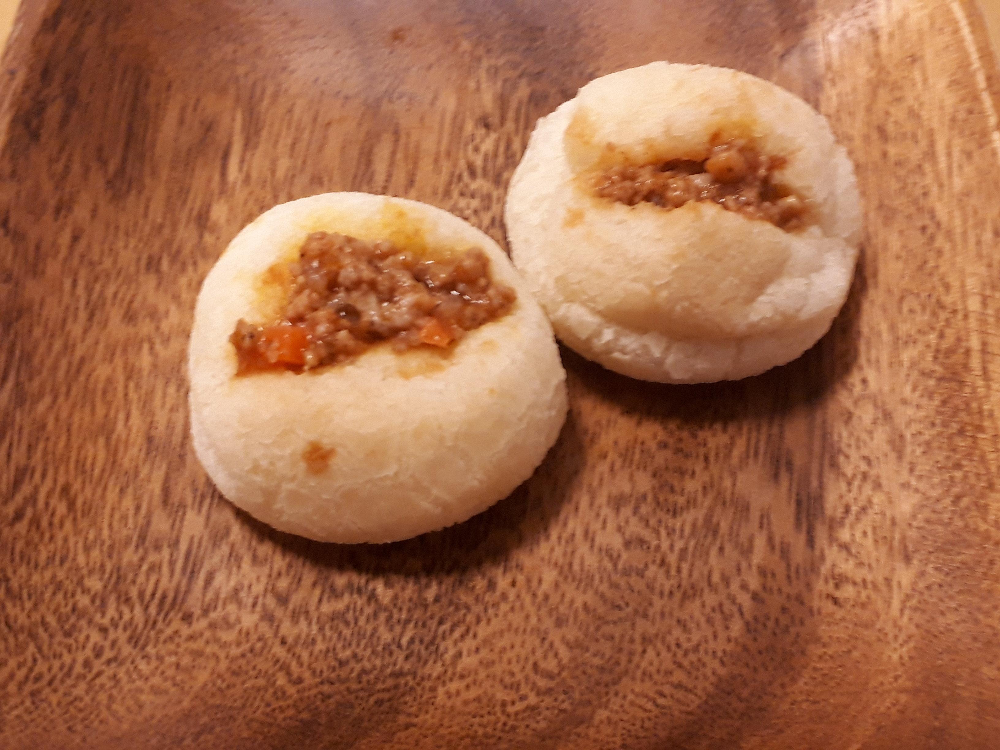 ポン・デ・ケージョを割ると、中はモチモチ食感のチーズパンです。そのままで十分おいしいですが、わが家では手づくりミートソースをはさんだ食べ方が人気です。つくり方は簡単。ポン・デ・ケージョを少し割って、温めたミートソースをはさむだけで、おやつにオススメです!