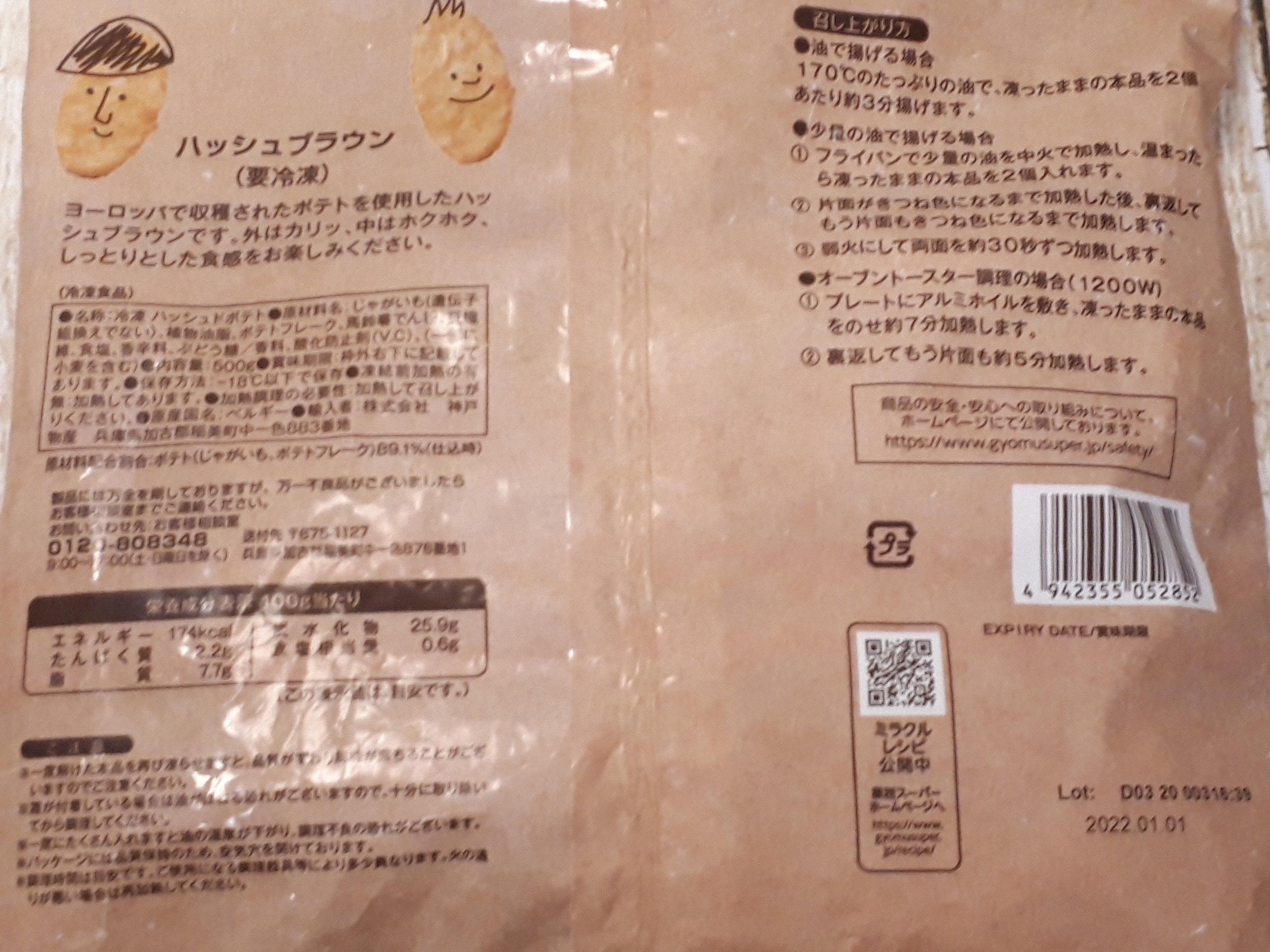 オススメ冷凍食品2点目は、ベルギーからの直輸入商品ハッシュブラウンです。1袋に8枚入って168円。1個あたり21円とこちらも高コスパ商品です。