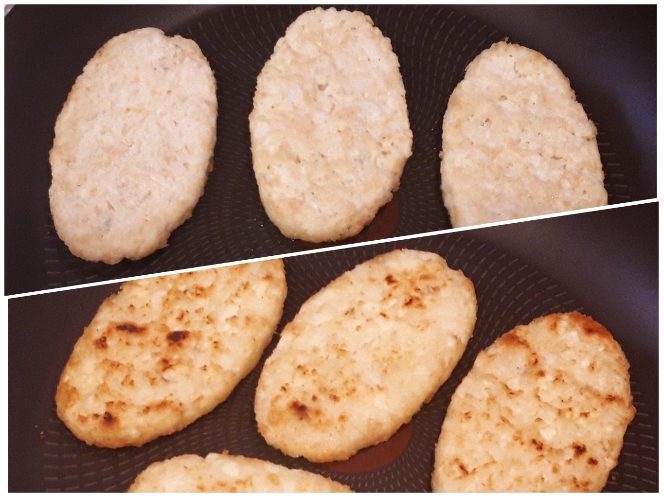 熱したフライパンに凍ったままのハッシュブラウンを置いて、やや弱火(弱火と中火の中間くらい)で片面5分ずつ焼きます(お使いになる調理器具によって火加減や時間は調整したほうがよいと思います)。