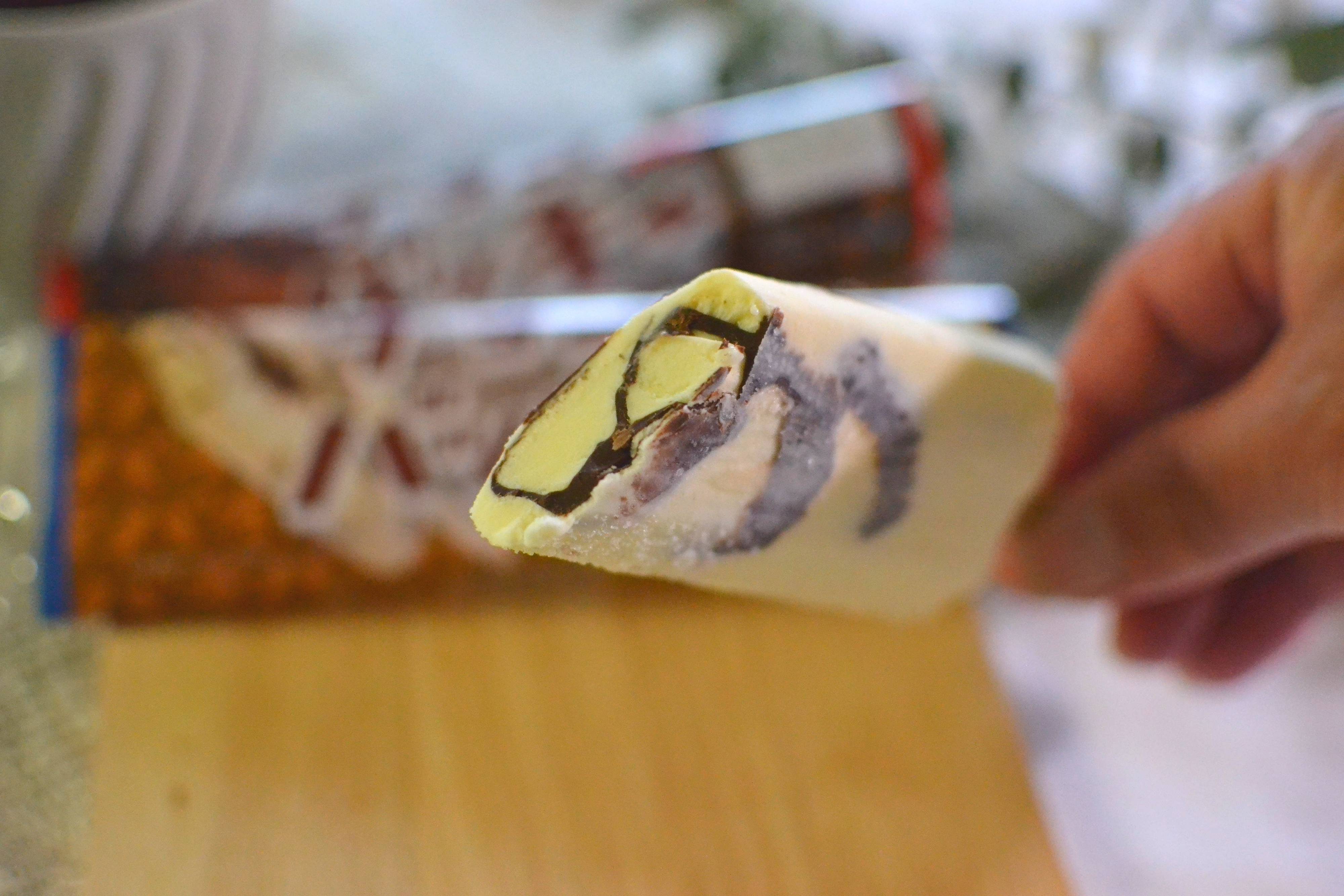 アイスバーの中にパリッと食感のスイートチョコが折り重なるように入っています。
