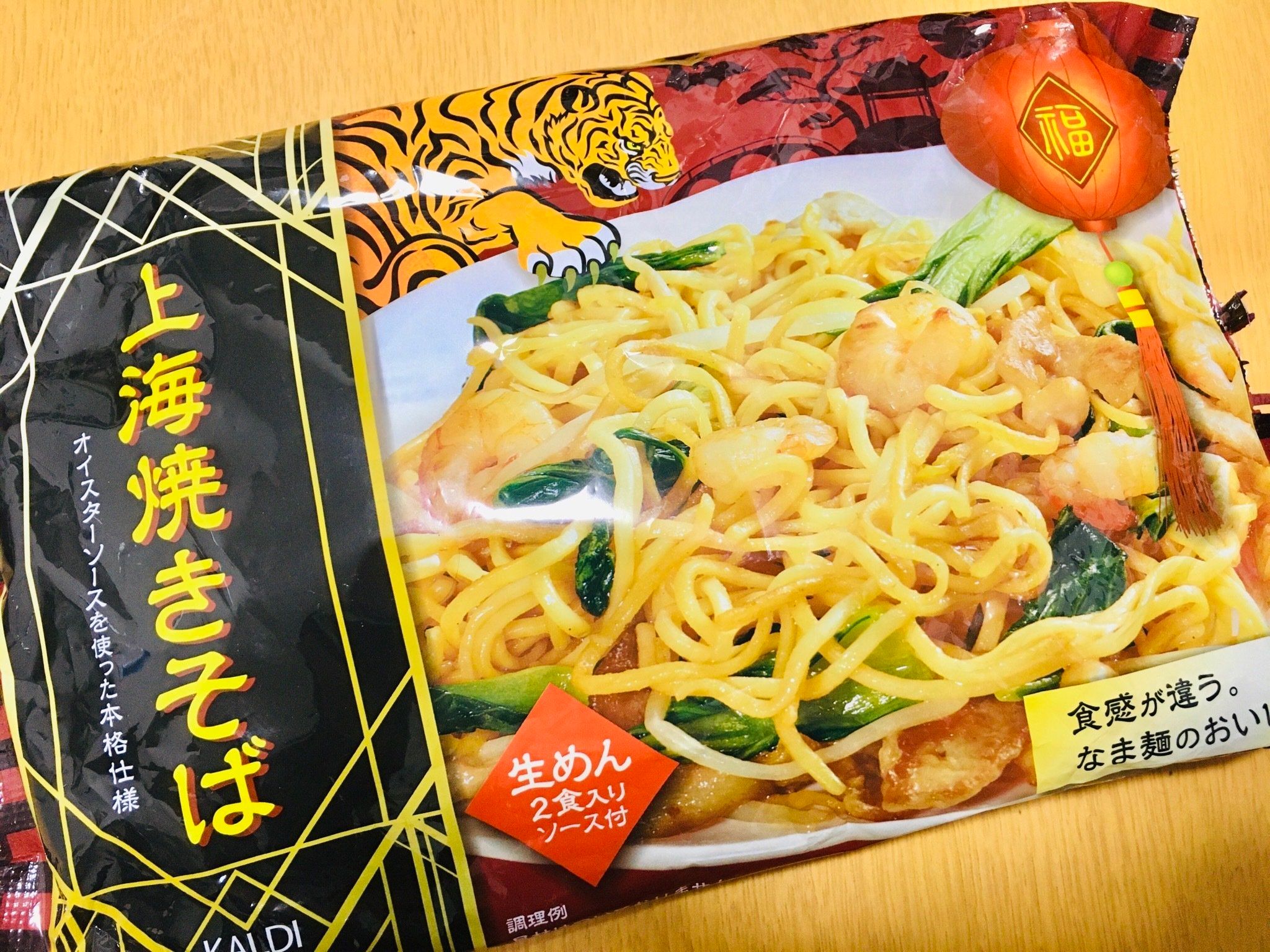 カルディの上海焼きそばは2食入りで220円(税込)。乾麺があまり好きではないのですが、生麺でこの値段はコスパがいい!スーパーのチルドコーナーに売られている太麺焼きそばは300〜400円くらいするので、安いと感じました。