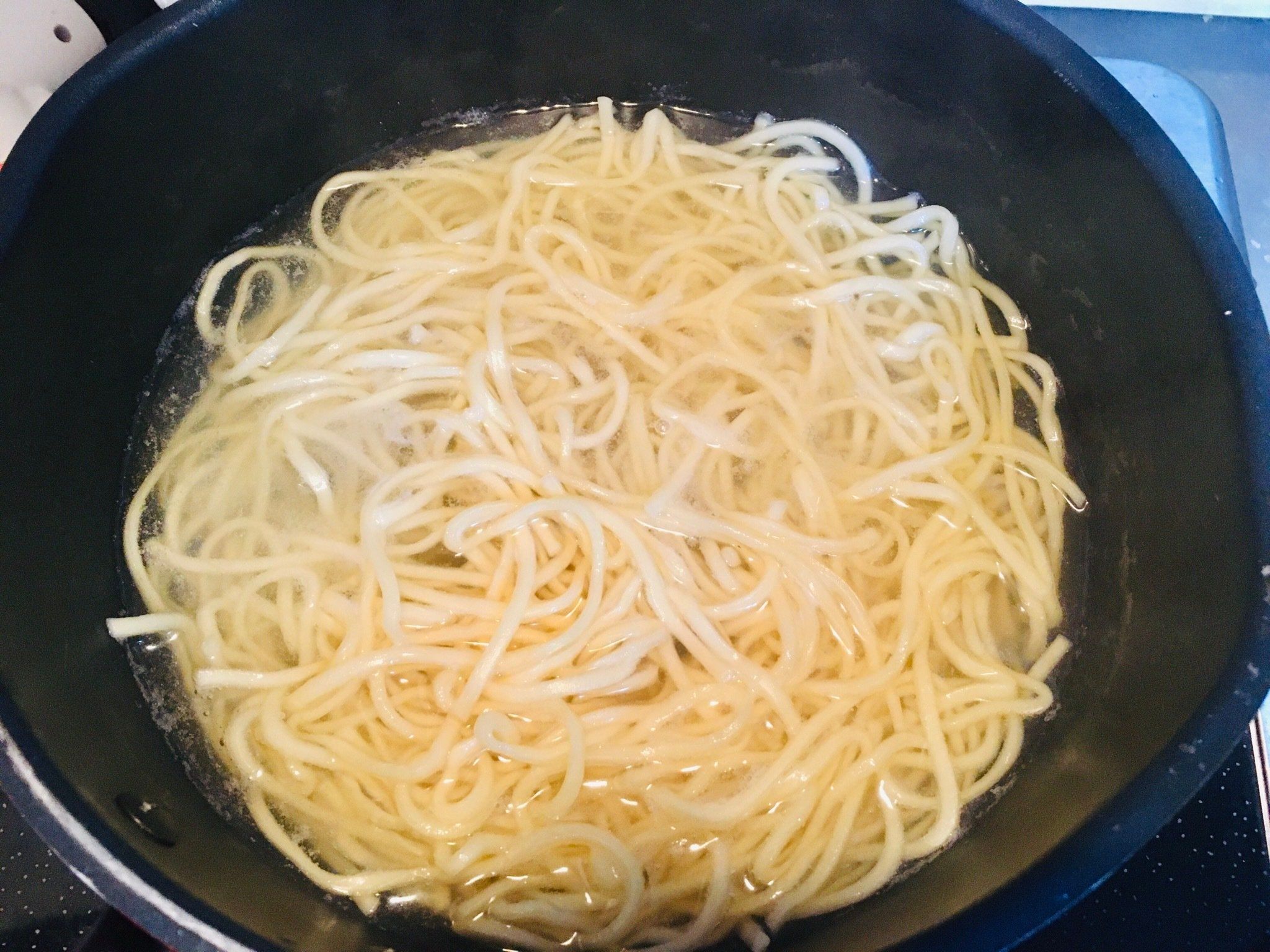 まず、麺を記載分量のお湯で3分茹でます。いきなり炒めないので注意が必要です。