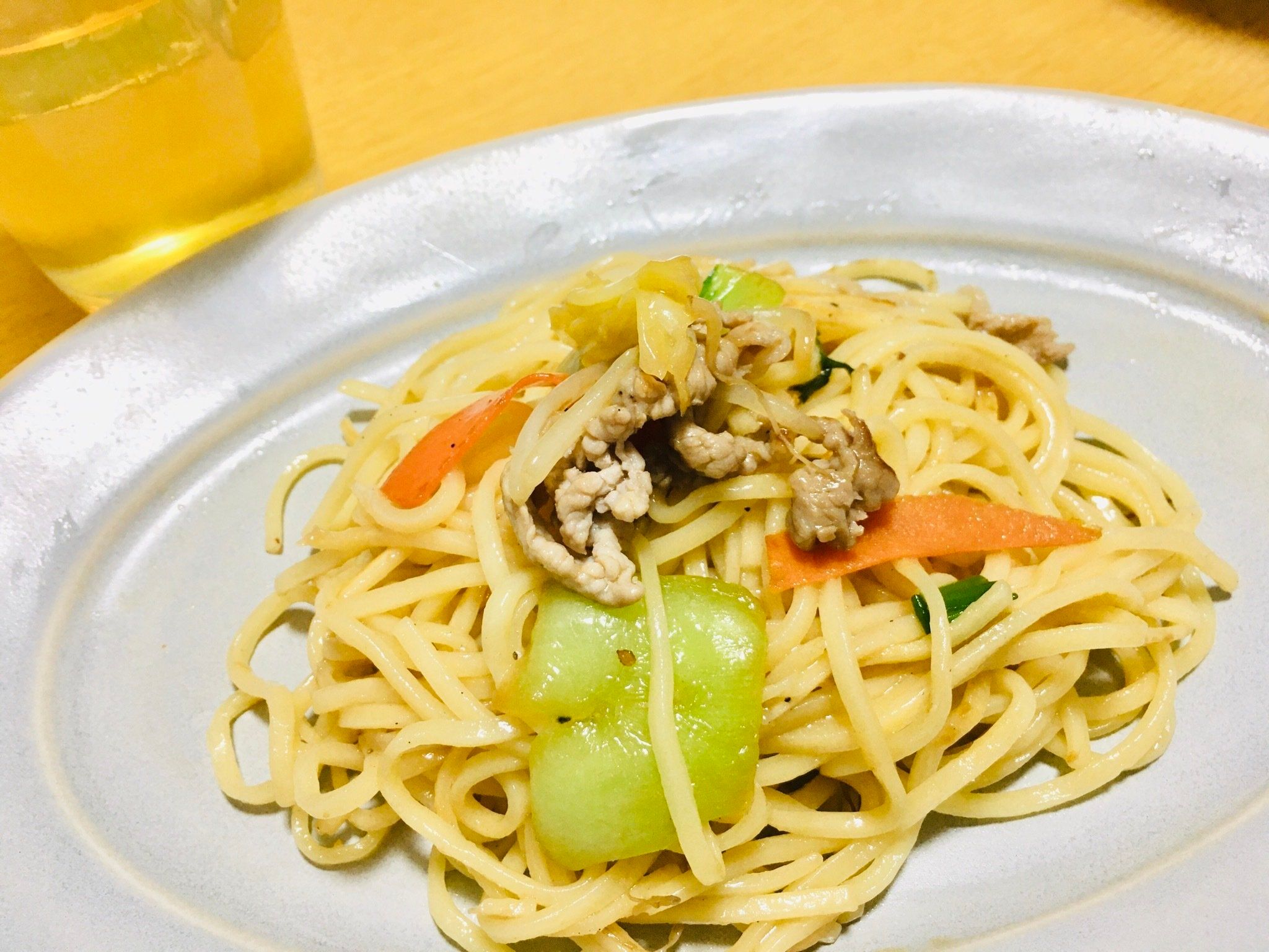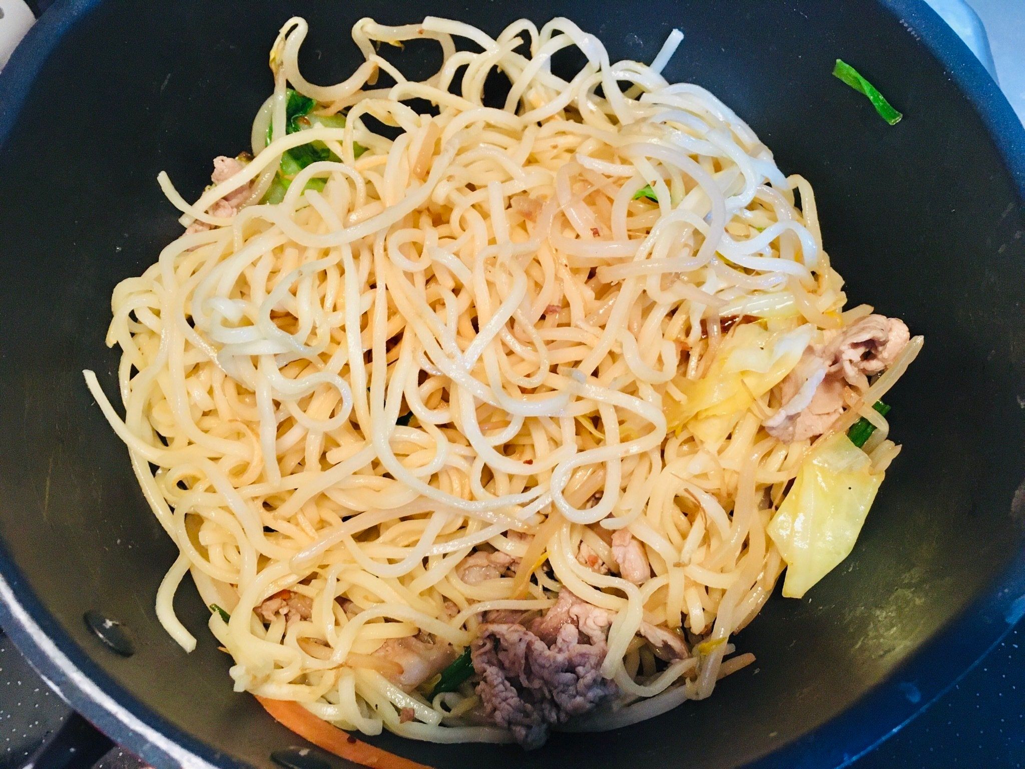 茹でたら湯切りをし、サラダ油を麺全体にからませます。フライパンに油を引かずに麺を入れ、水分を飛ばしながら麺に焦げ目がつくまで焼きます。野菜や肉を入れる場合は、一度麺を取り出してから炒めて下さい。わが家では、前の日の余り物の肉野菜炒めを入れました。