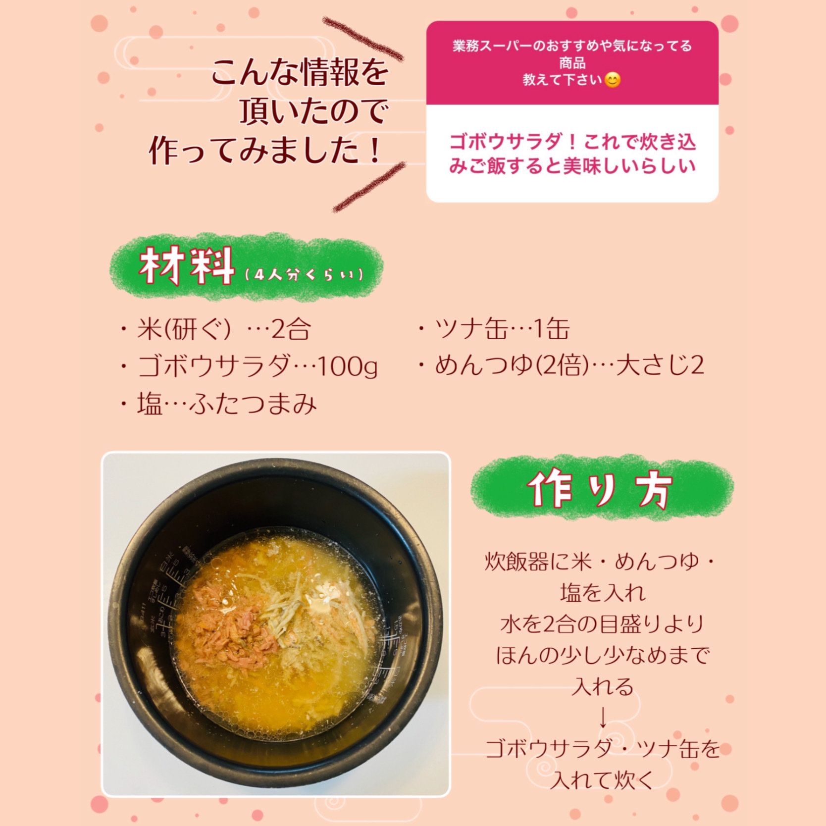 先日Instagramのフォロワーさんたちに、業務スーパーのおすすめ商品について質問したら『ゴボウサラダで炊き込みごはんをつくるとおいしい』という情報をいただいたんです。レシピを検索してみたけど見つからなかったのでわたし流で作ってみたら、とってもおいしくできたので紹介したいと思います。ラクラクの包丁なし、材料少なめのレシピです。