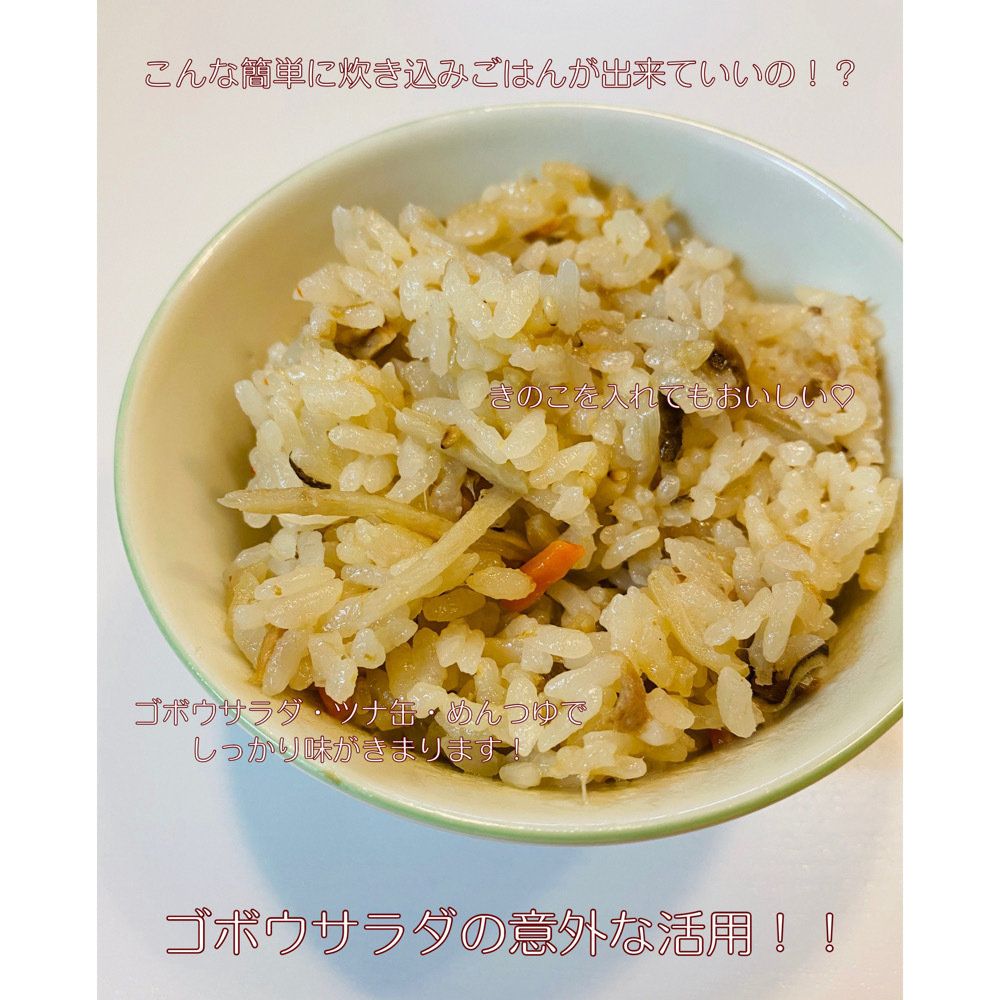 子どもがおかわりして食べてくれました!きのこやコーンを入れてもおいしいかもしれません。炊き込みごはんは具材もいっしょに入ってるので満足感もあるし、おにぎりにしてもいいですよね。ゴボウサラダでこんなにおいしい炊き込みごはんができるなんて、意外な活用方法でした!