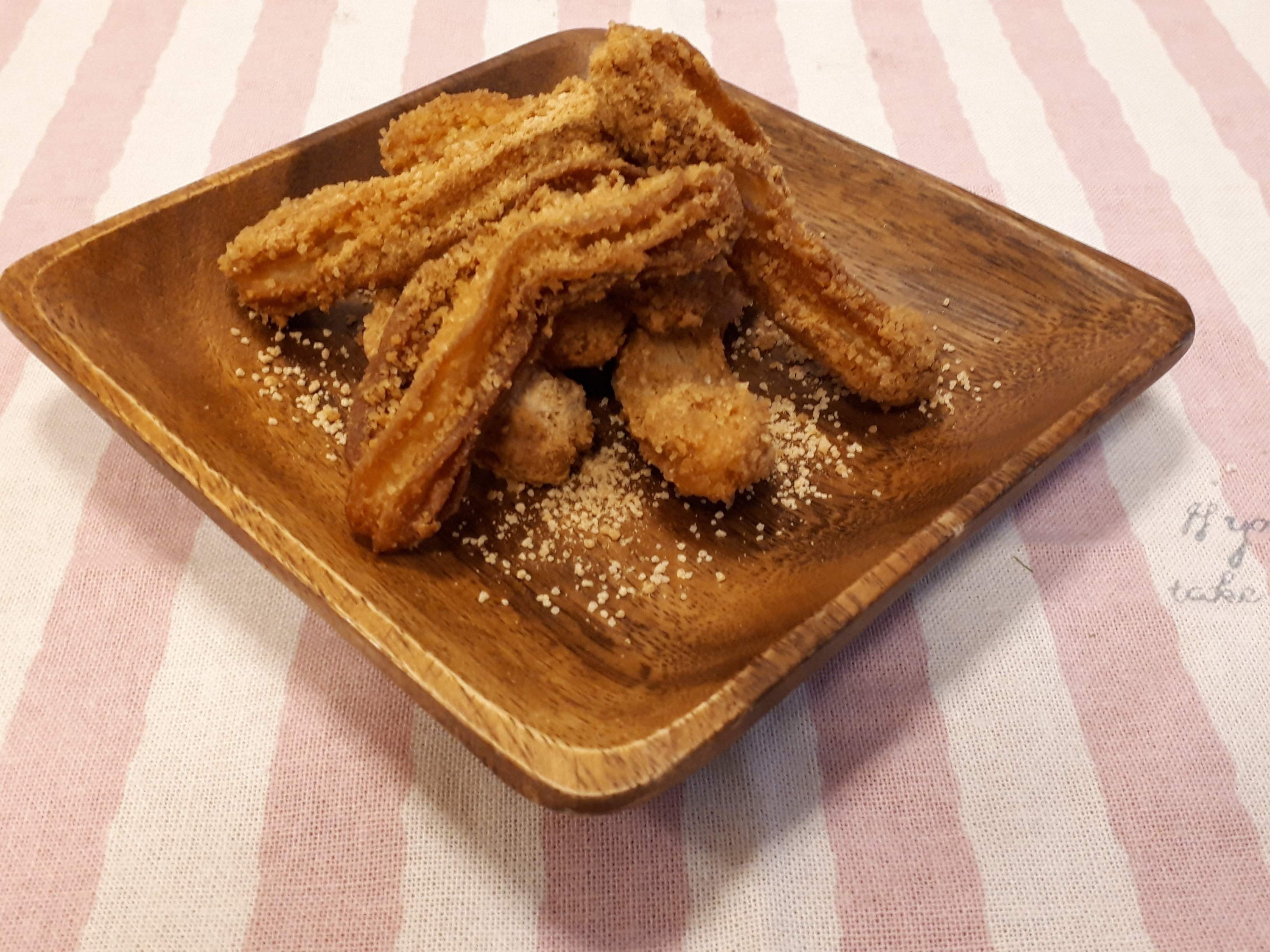 きな粉やシナモンシュガーなどのパウダー系は、揚げたての方がチューロスに絡みやすいので揚げたて(油をきった後すぐ)にふりかけます。