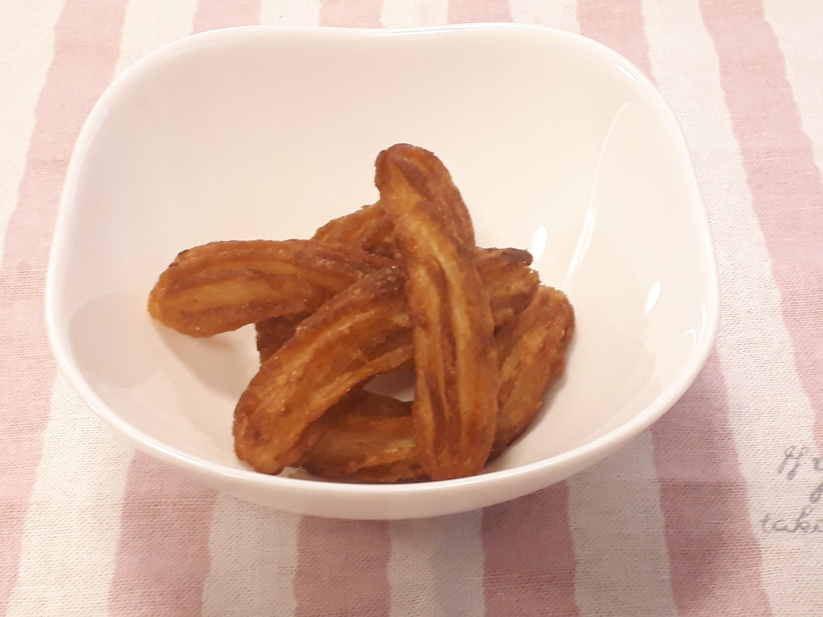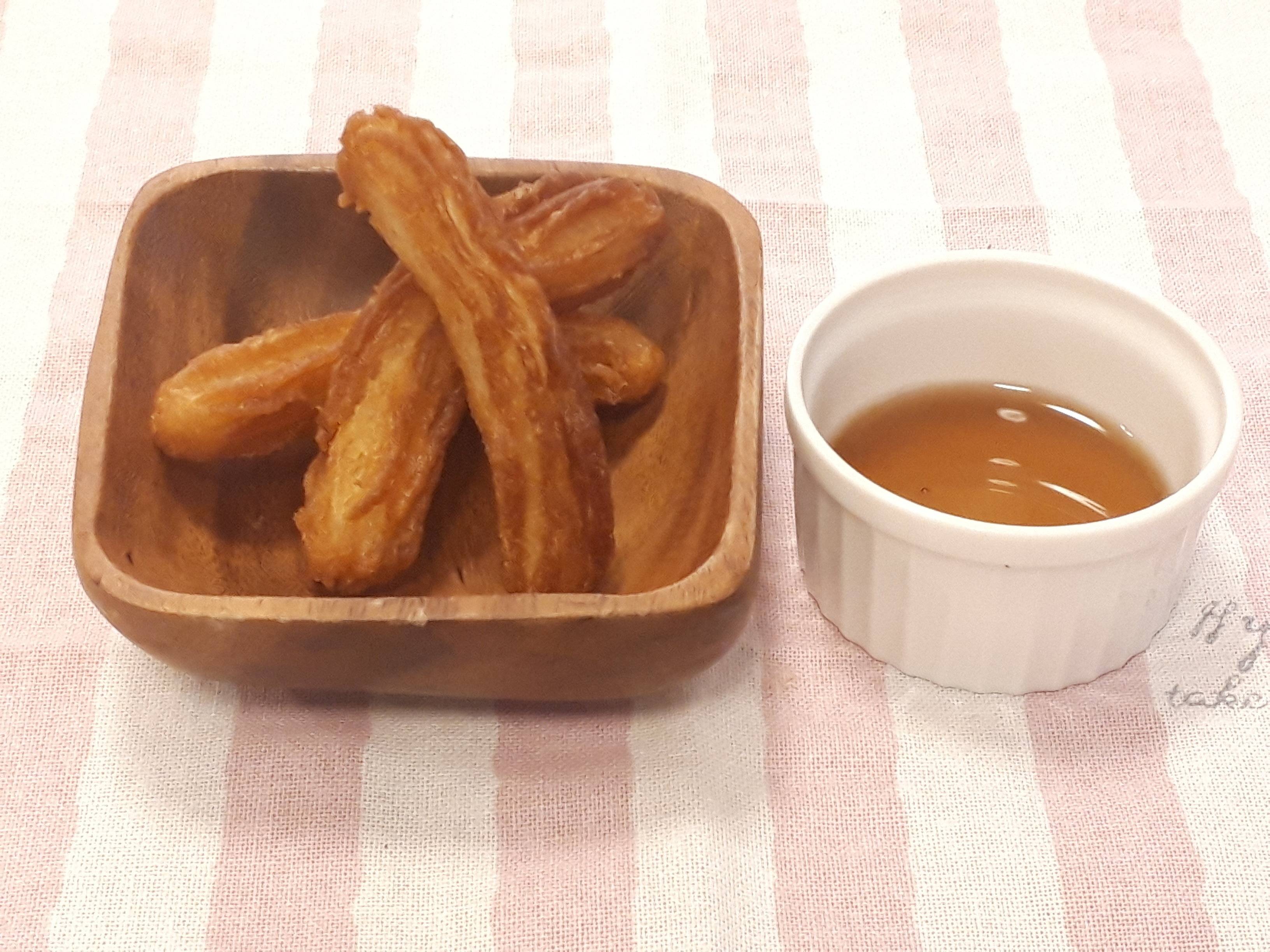 業務スーパーの人気商品「チューロス」は、1袋に500g(30~40本程度)入って118円で販売されています。強力粉やバター等の材料やしぼり袋&絞り金を用意して自分で作るよりも安く短時間ででき、国内製造というのもおすすめポイントです。パッケージ裏に記載されている「お召し上がり方」に従って、180℃に熱した油に凍ったままのチューロスを入れきつね色になるまで揚げます。揚げたら、砂糖(グラニュー糖)をまぶしたり、チョコを付けたりと自分好みにアレンジして完成です。