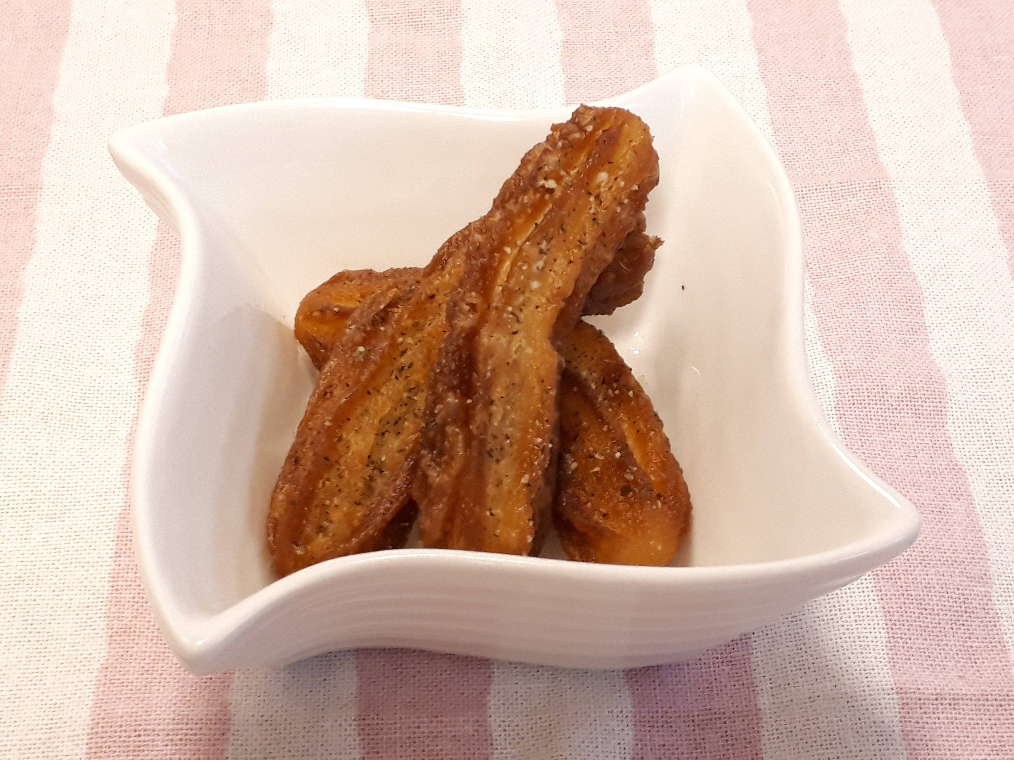 そして、こちらがお酒好きな私のおすすめアレンジハーブソルトがけです!写真のチューロスにかけているハーブソルトは自家製で、バジルやオレガノ、ローズマリー、タイム、ガーリックなどのハーブと塩をミックスしたものですが、お手軽なところではクレイジーソルトもおすすめです。また、「ブラックペッパー+塩」をかけるだけでもおいしいです。子どもに人気のチューロスが大人のおつまみに変身しちゃいますよ!