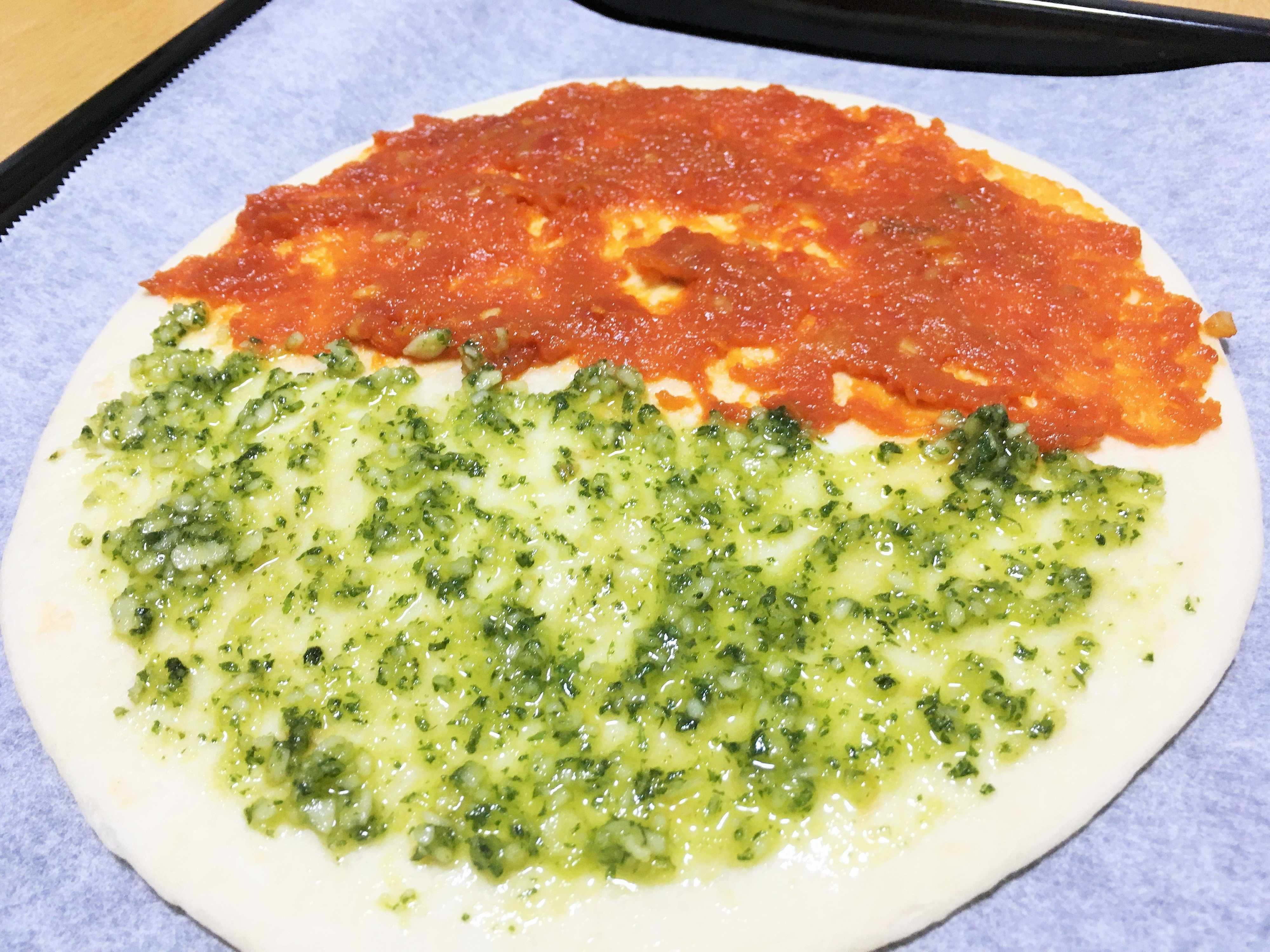今回、せっかくだからとジェノベーゼのほかに、トマト缶を煮詰めてトマトソースも作成。それを使った2色ピザにしました。