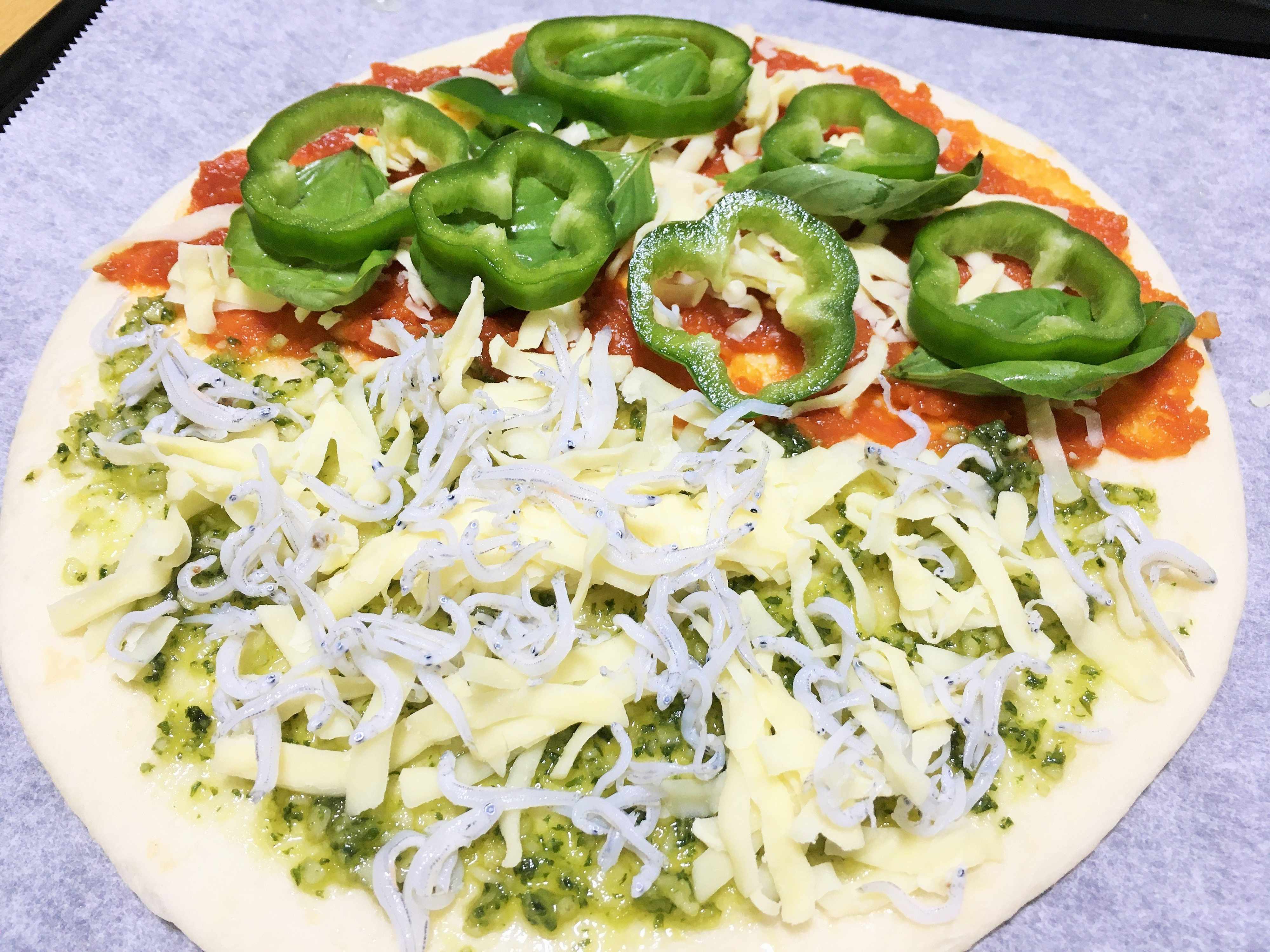 続いて具材をトッピング。全体にチーズをのせ、ジェノベーゼの方にはしらすを、トマトソースの方はピーマンとバジルをトッピング。