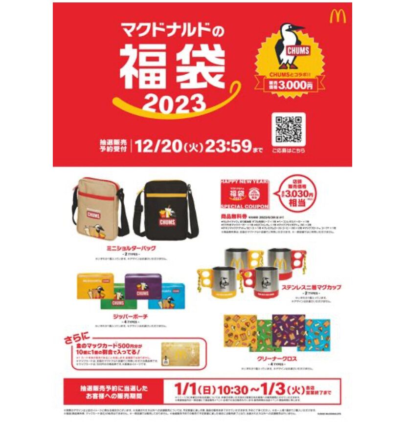2023年のマクドナルドの福袋はCHUMSとのコラボレーション福袋でした。福袋の中身は、マクドナルドの商品とCHUMSのアイコンである「ブービーバード」がデザインされたオリジナルのコラボアイテム。「ミニショルダーバッグ」「ステンレス 二層マグカップ」「クリーナークロス」「ジッパーポーチ」のほか、「マクドナルド商品無料券(税込合計3,030円相当)」。さらに福袋10個に1個の割合で入っている特別デザインの「金のマックカード500円分」が入っていました。